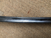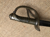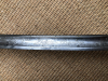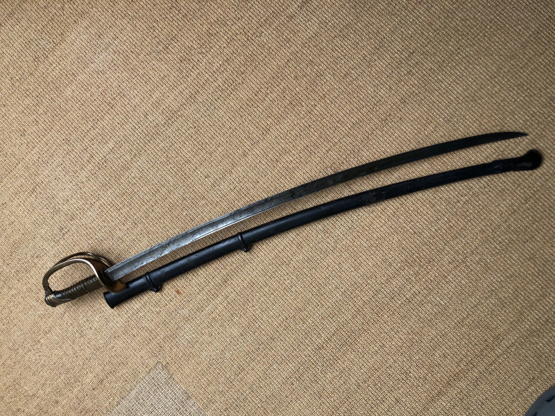 Aus Sammlungsauflösung wird ein französischer Kavalleriesäbel Modell 1822 angeboten. Das Gefäß ist aus Messing mit einem Griff aus dunklem Horn. Die Drahtwicklung ist beschädigt. Die 30 mm breite und ca. 910 mm lange Klinge ist in altersgemäß gutem Zustand (leicht fleckig). Beide Seiten der Klinge und der Klingenrücken sind mit floralen Zierätzungen versehen. Die Klingenseiten tragen außerdem die Schriftzüge "Escadron de Lanciers" bzw. "2eme Legion Banlieue" Auf dem Klingenrücken befindet die Jahreszahl 1838 und möglicherweise ein Hinweis auf den Hersteller (siehe Foto) Die mattschwarze (nachlackierte ?) Scheide ist aus Eisen mit zwei Trageringen. Sie hat ganz leichte Bulen im unteren Bereich.