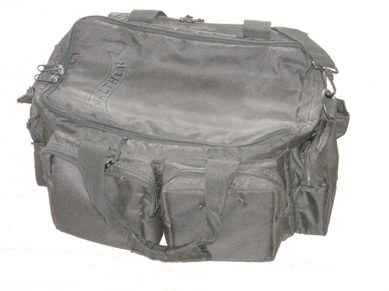Sie bieten auf eine neuwertige Walther Range Bag aus schwarzem reißfesten Nylon. Die Außenmaße betragen ca. 47cm x 37cm x 27cm, sie bietet Platz für 2 bis 3 Kurzwaffen und Zubehör. Die Tasche hat 4 kleinere und eine große Außentasche, eine herausnehmbare Innentasche, einen Schultergurt und abschließbare Reißverschlüsse. Die Tasche ist fast wie neu, ich habe sie vielleicht 10x benutzt, jetzt steht sie nur herum. Dafür ist sie zu schade. Privatverkauf, keine Garantie, keine Rücknahme.