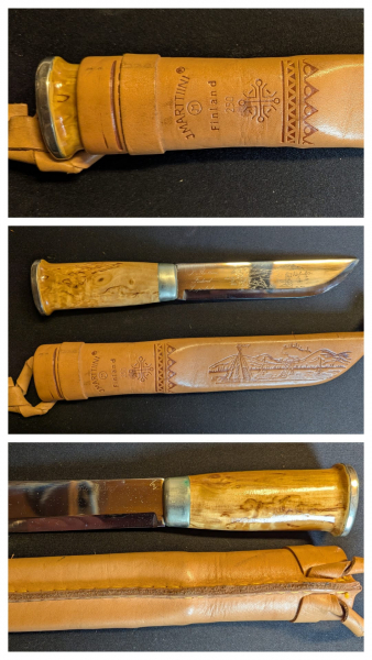 Schönes Jagdmesser aus Finland von J.Marttiini Lederscheide und Verzierungen auf der Klinge Länge ca 27 cm siehe Bilder