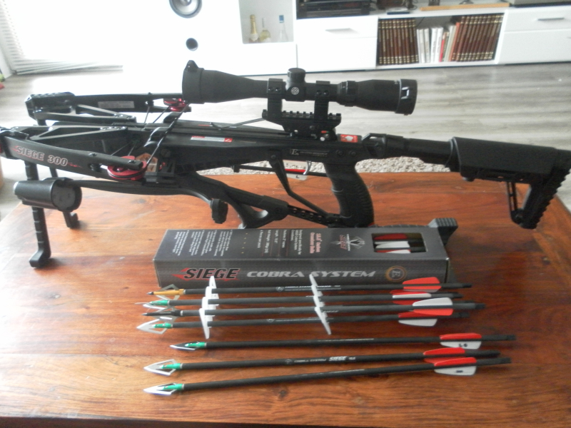 Verkaufe hier meine gepflegte Siege 300. Verkauft wird sie so wie dargestellt mit 2 Köchern, 17 Bolzen, wovon ich 9 Stück mit Jagdspitzen ( 2- und 3 Klingen) versehen habe. Neue Sehne und neue Kabel - aber ohne OVP. Dazu gehört ein nagelneues und noch nicht eingeschossenes 3-9x40 Zielfernrohr..