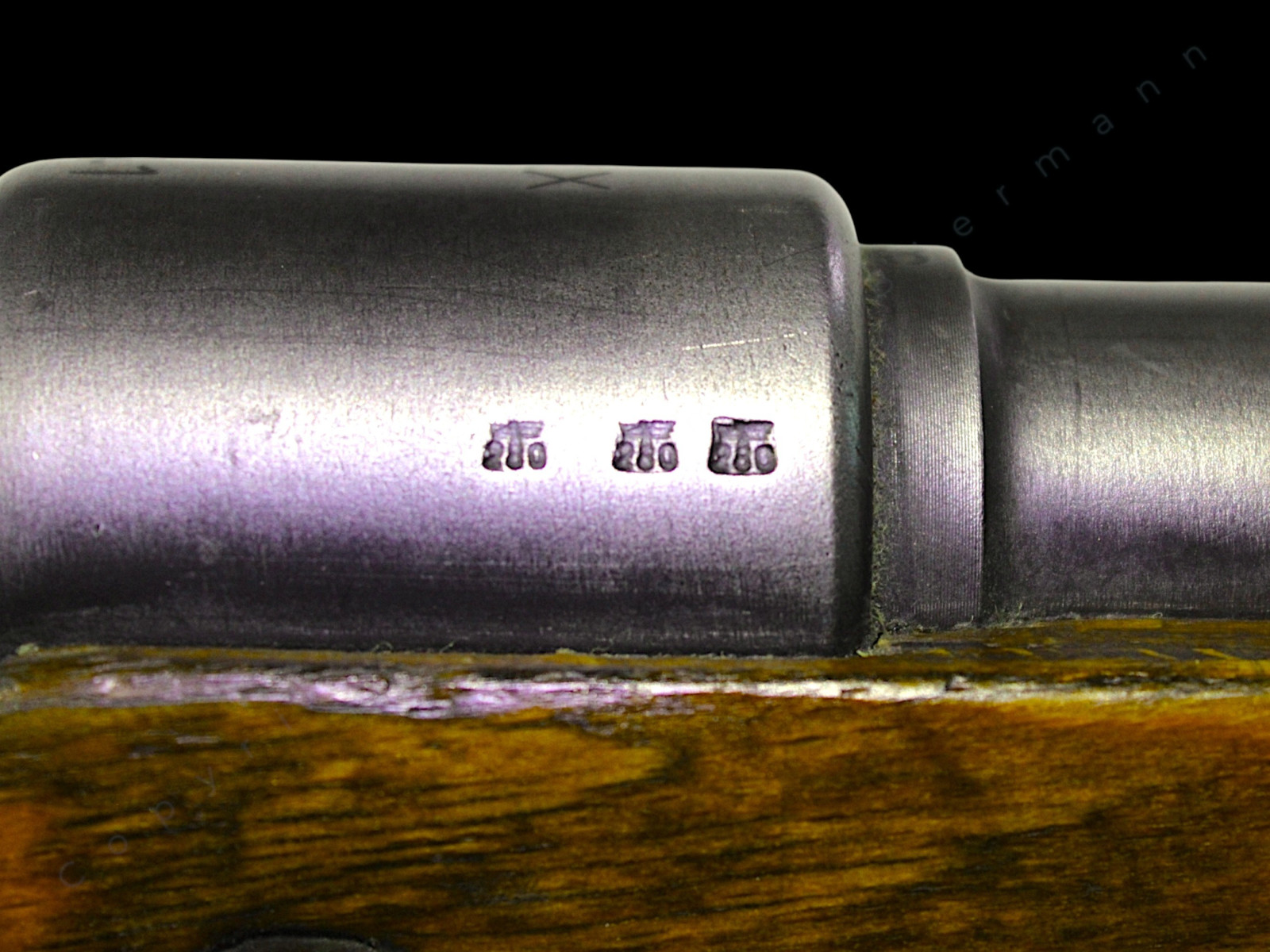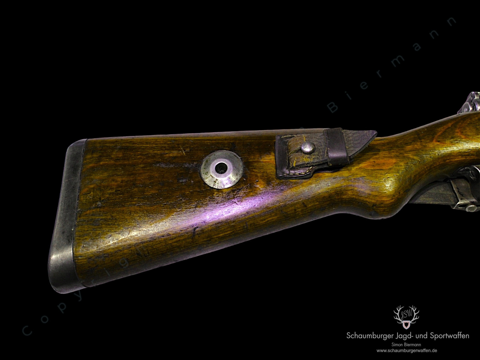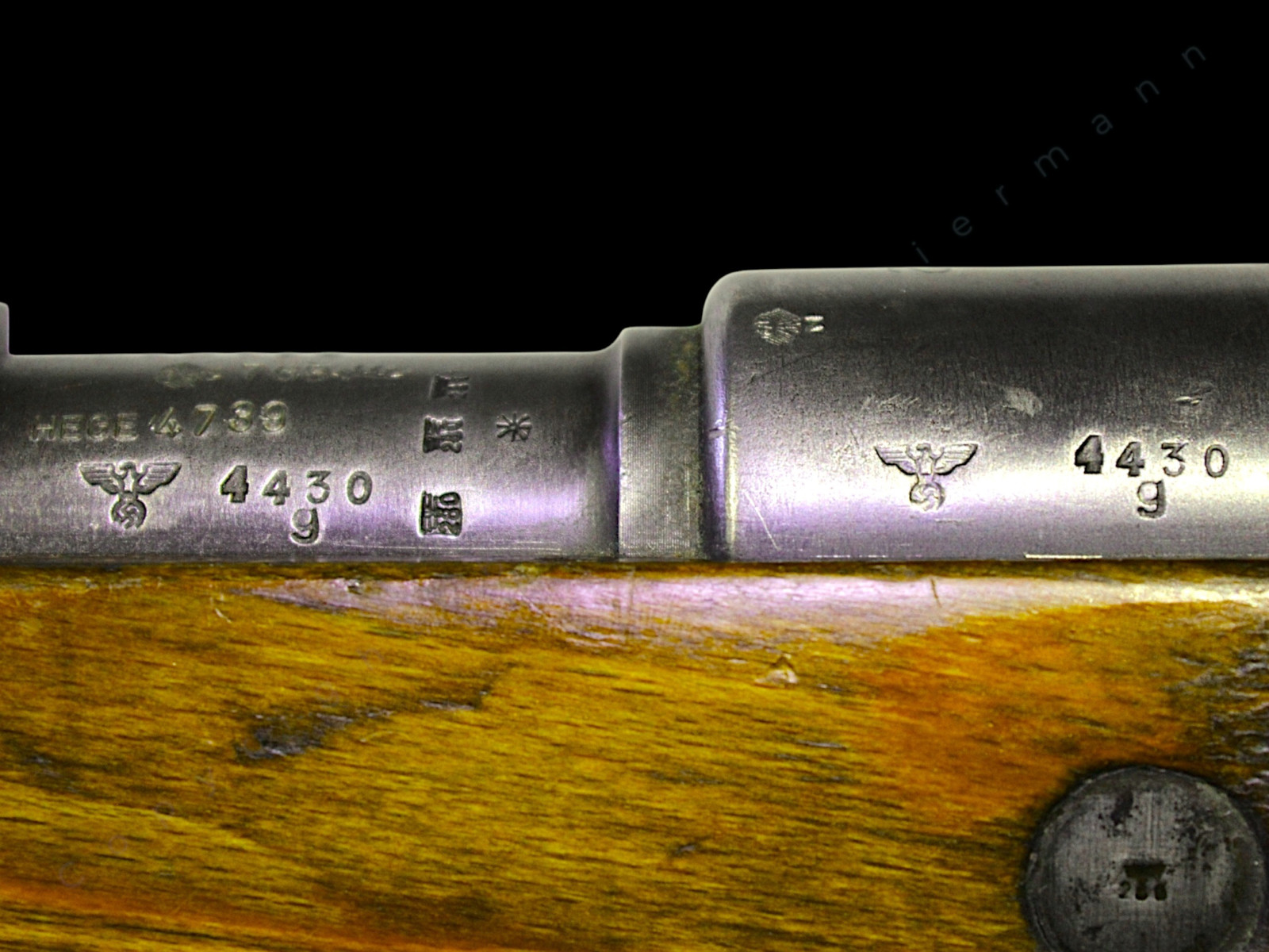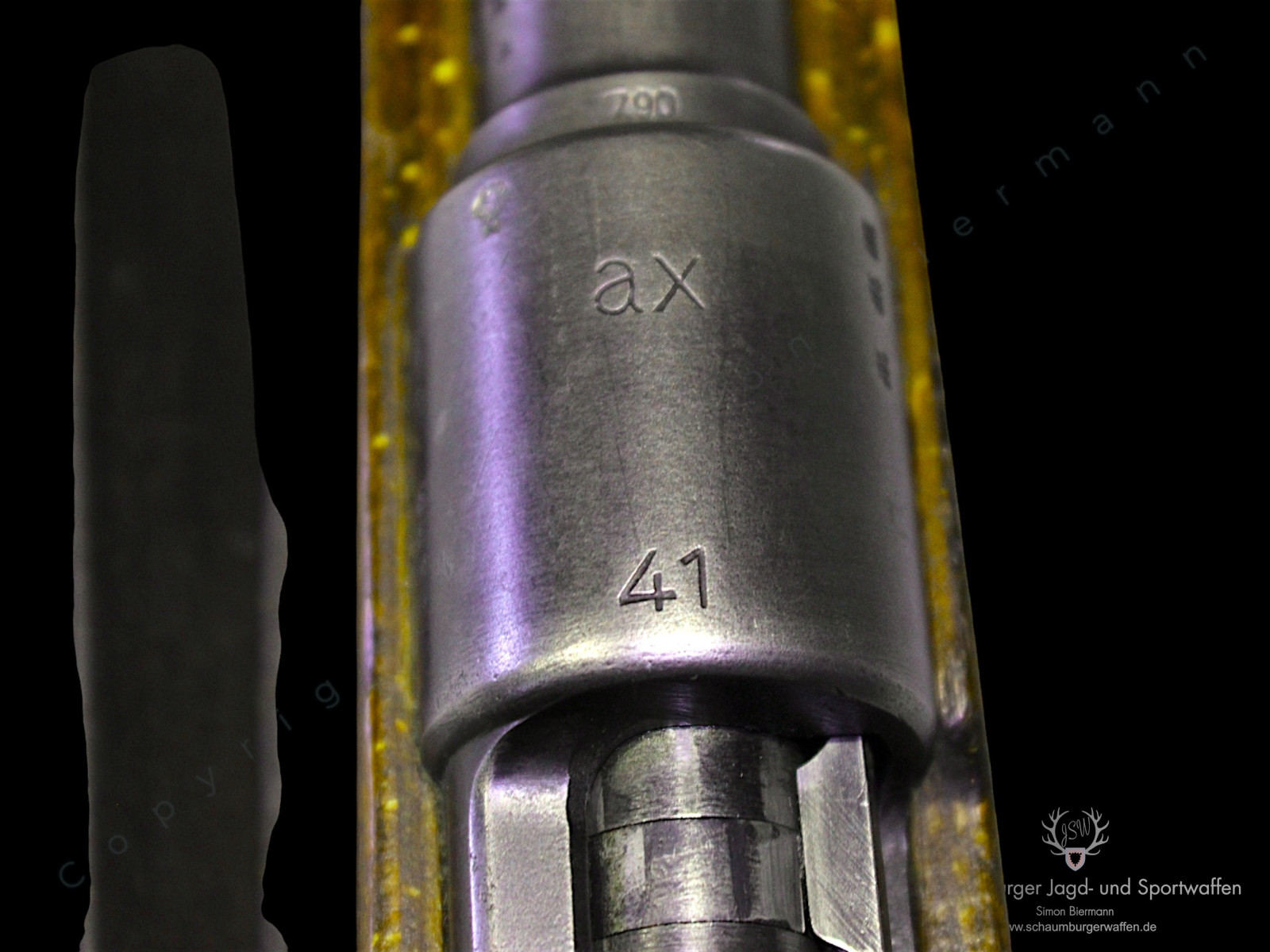 Eine der seltensten Versionen des deutschen Wehrmachtskarabiners K98k. Der Hersteller "Feinmechanische Werke" (heute Erma), mit dem WH Code "ax" hat nur knapp 0,7% der Jahresproduktion des K98k in 1941, bezogen auf die Gesamtproduktion zwischen 1934 und 1945 hergestellt!