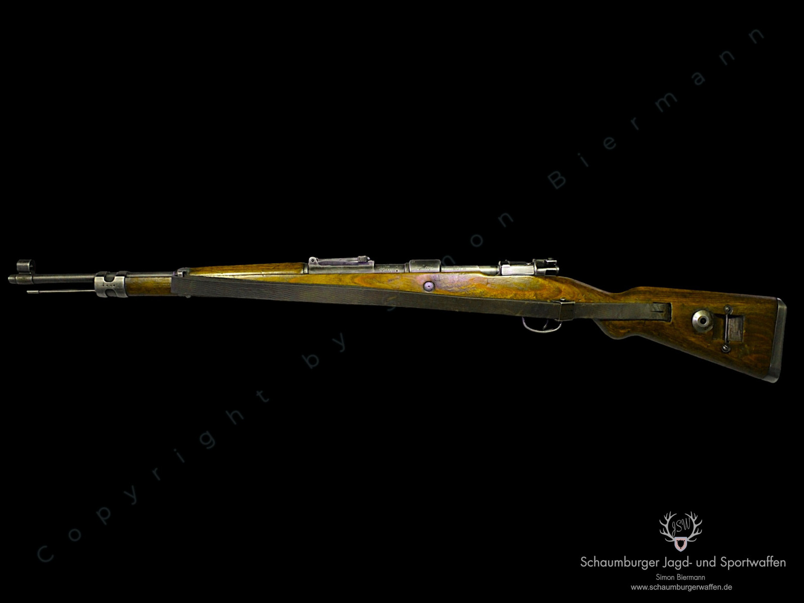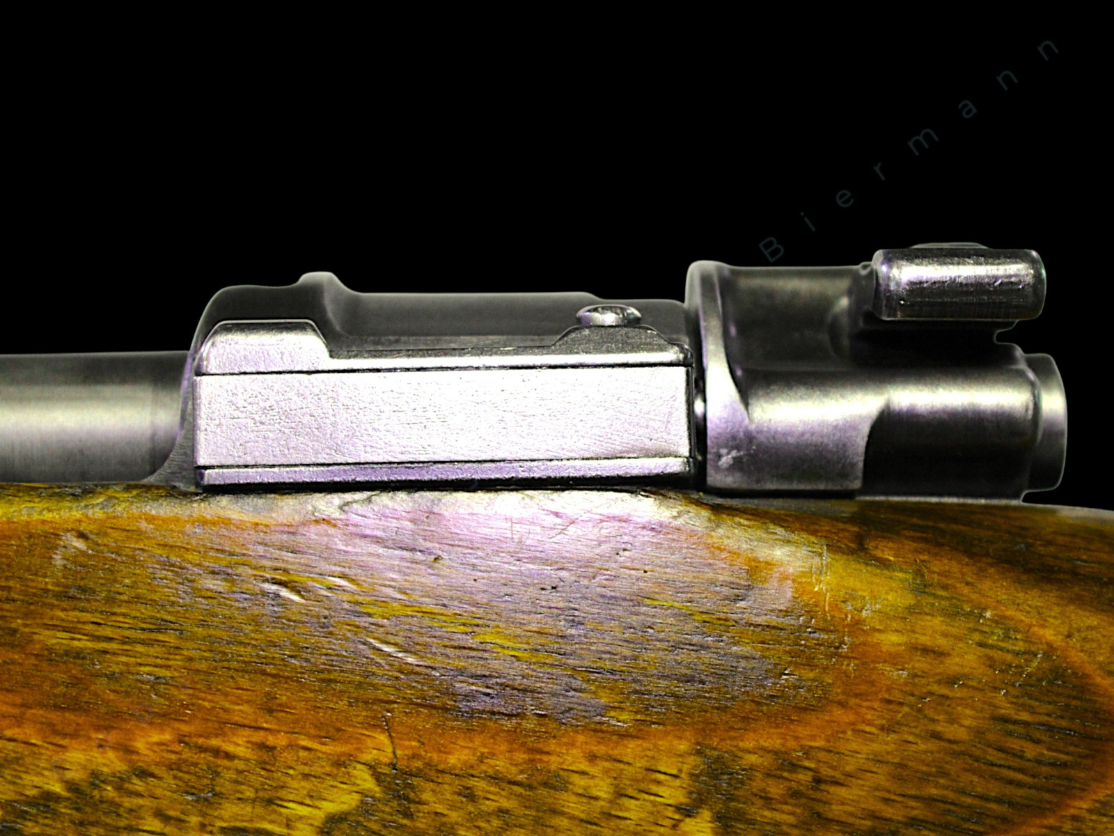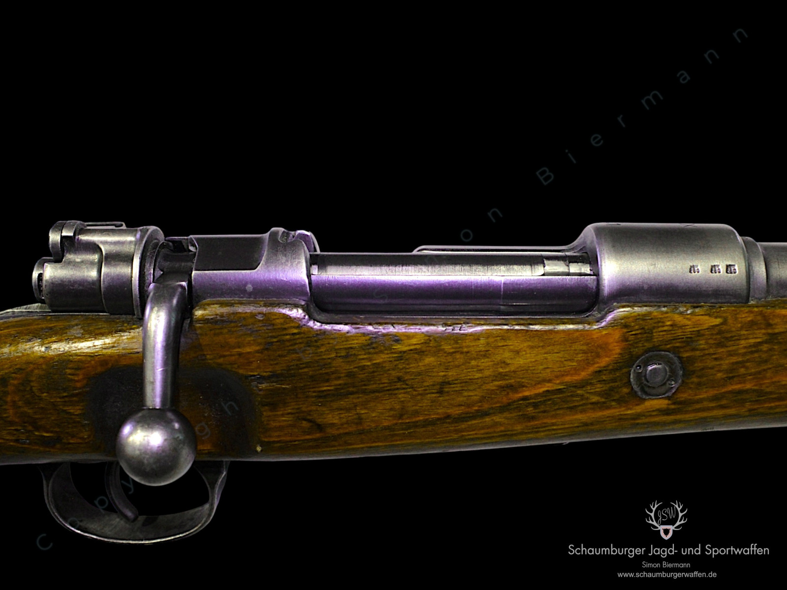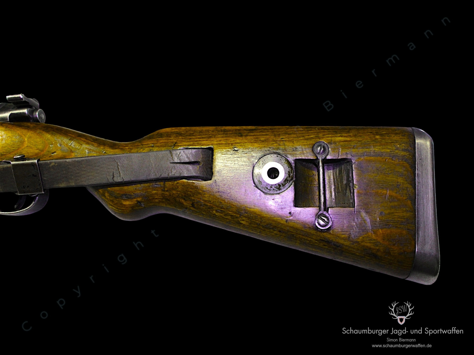 Eine der seltensten Versionen des deutschen Wehrmachtskarabiners K98k. Der Hersteller "Feinmechanische Werke" (heute Erma), mit dem WH Code "ax" hat nur knapp 0,7% der Jahresproduktion des K98k in 1941, bezogen auf die Gesamtproduktion zwischen 1934 und 1945 hergestellt!