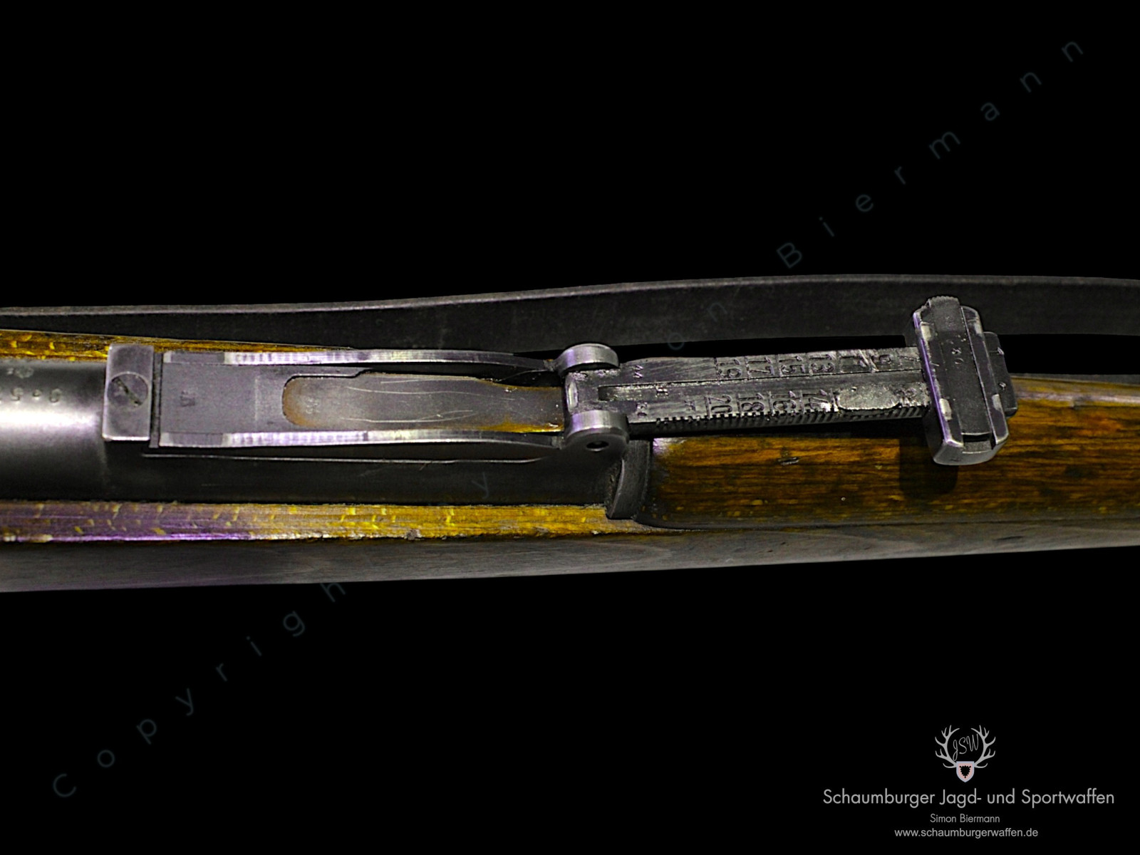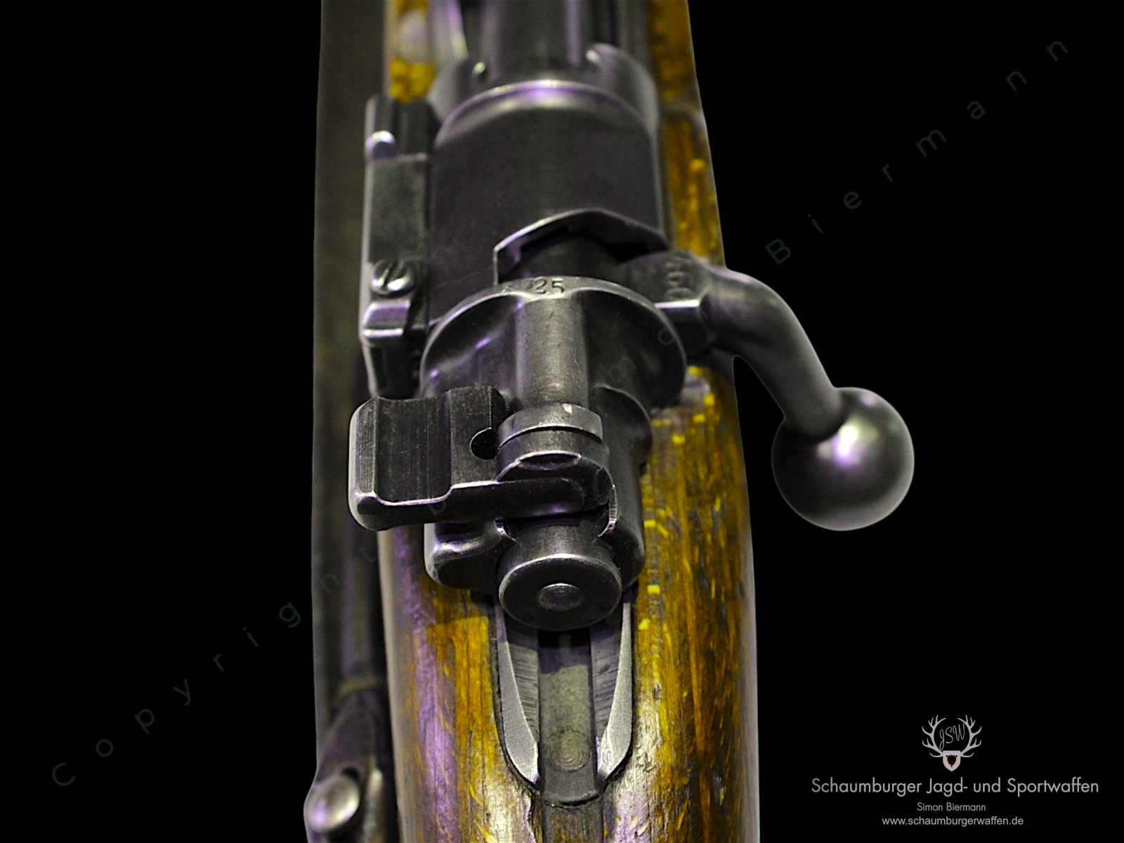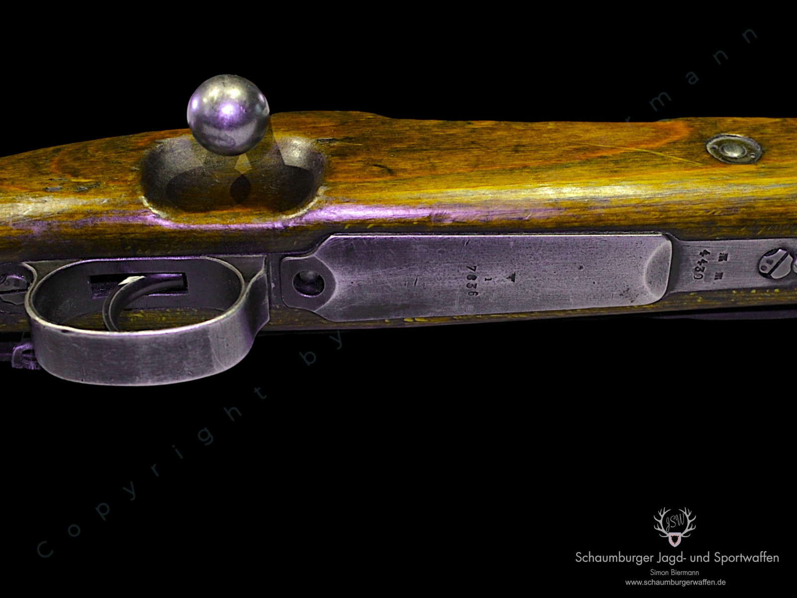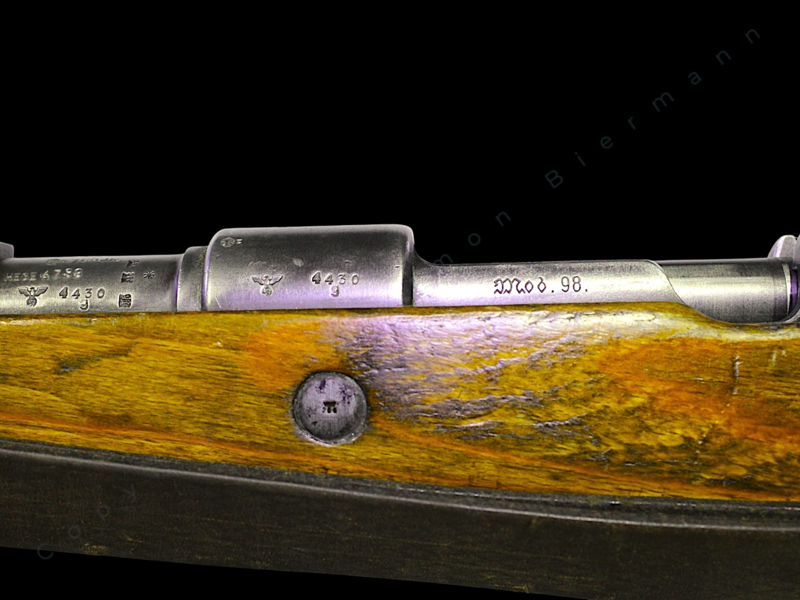 Eine der seltensten Versionen des deutschen Wehrmachtskarabiners K98k. Der Hersteller "Feinmechanische Werke" (heute Erma), mit dem WH Code "ax" hat nur knapp 0,7% der Jahresproduktion des K98k in 1941, bezogen auf die Gesamtproduktion zwischen 1934 und 1945 hergestellt!