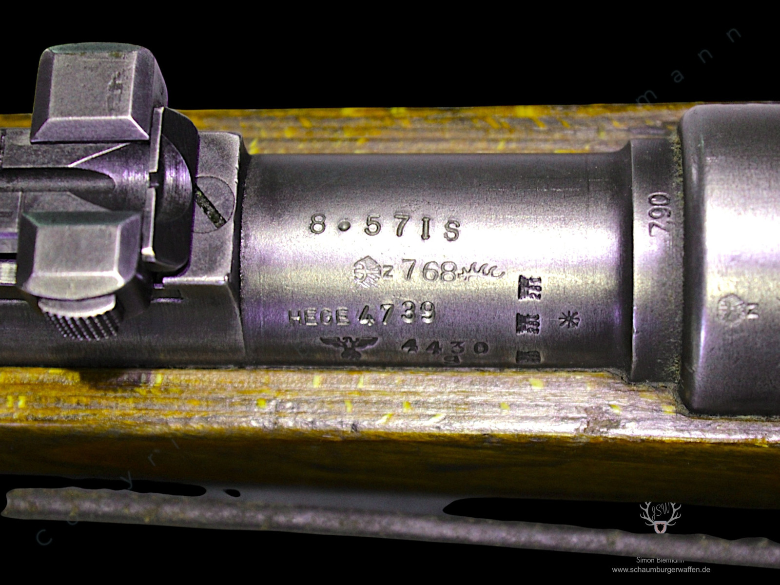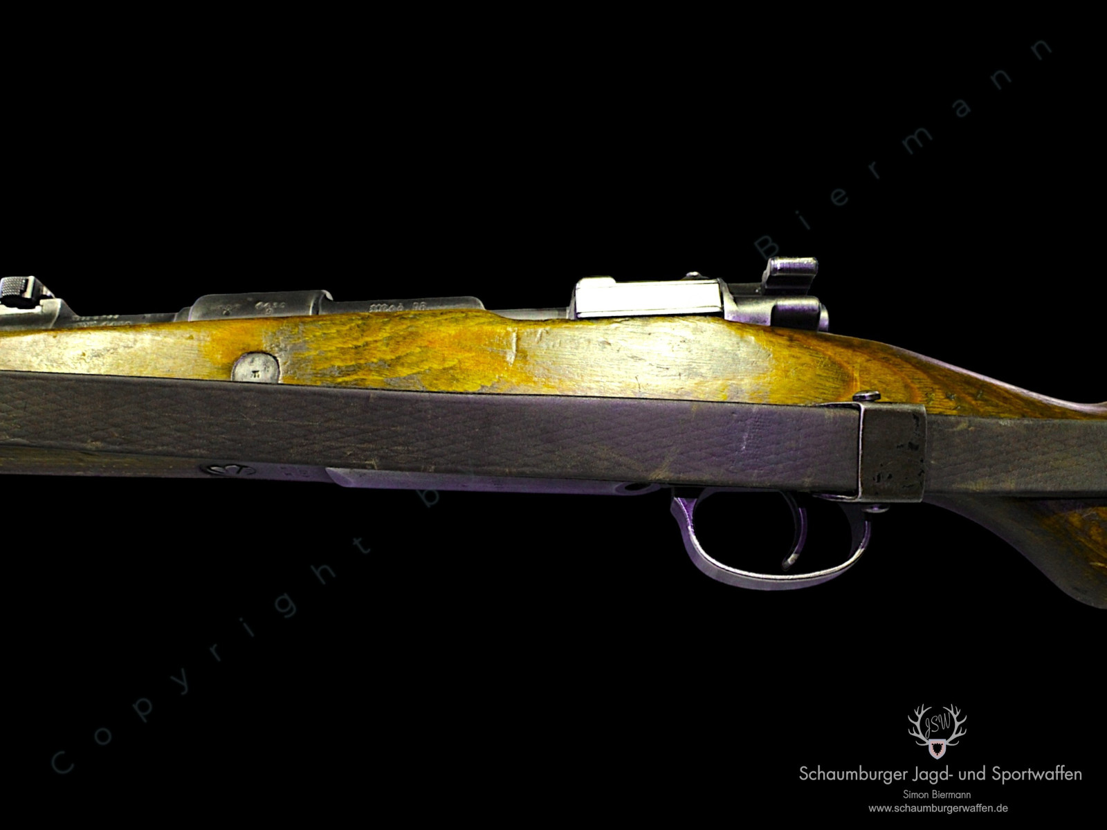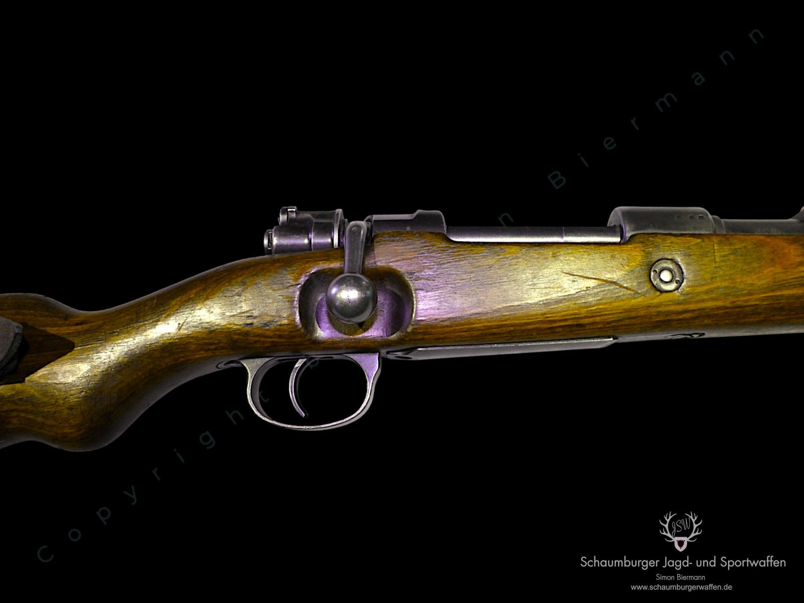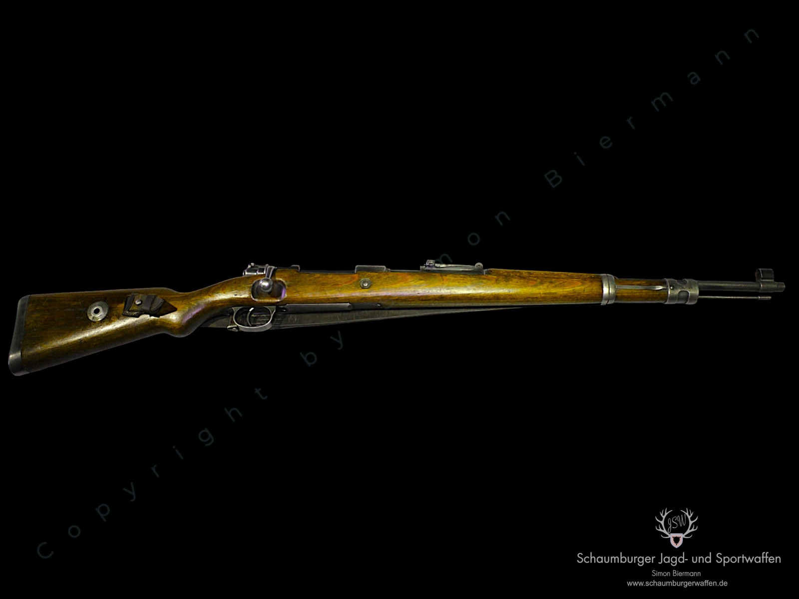 Eine der seltensten Versionen des deutschen Wehrmachtskarabiners K98k. Der Hersteller "Feinmechanische Werke" (heute Erma), mit dem WH Code "ax" hat nur knapp 0,7% der Jahresproduktion des K98k in 1941, bezogen auf die Gesamtproduktion zwischen 1934 und 1945 hergestellt!