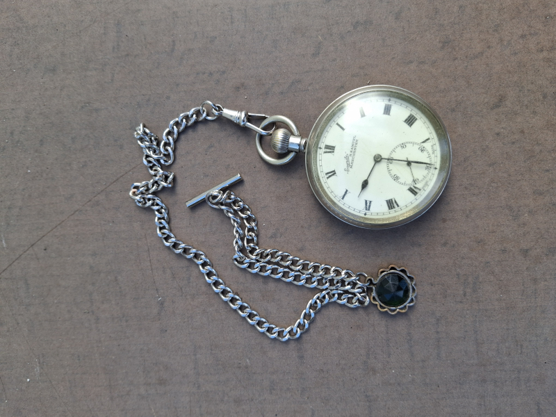 Antike englische Taschenuhr mit Uhrkette "H Samuel Manchester". Halteschraube der Aufzugsarretierung fehlt, kann vom Uhrmacher leicht behoben werden. Ansonsten in sehr schönen Zustand.