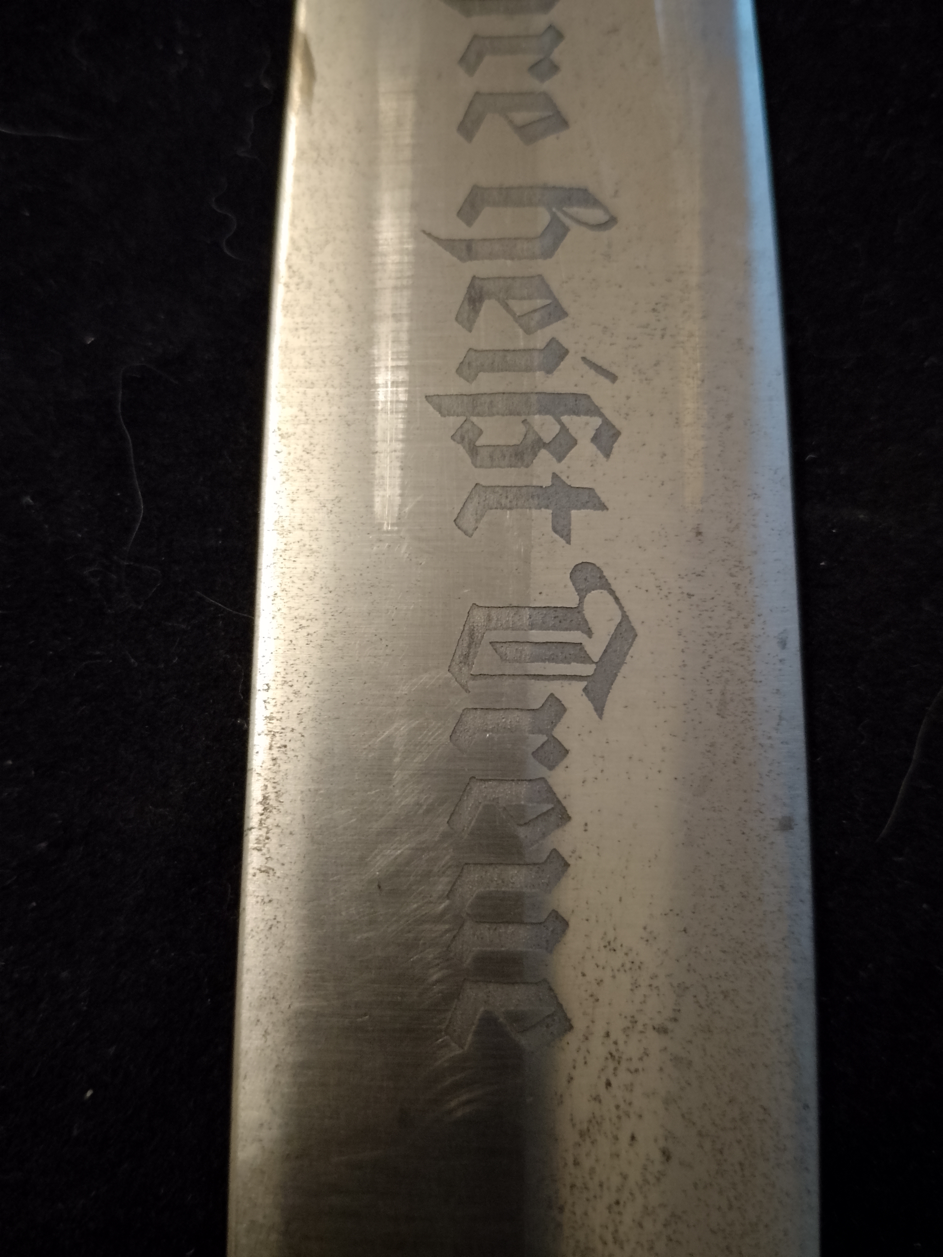Geschmiedete Klinge typische fließspuren vorhanden beide Seiten gleich tief geätzt, Hersteller an der richtigen Stelle, bitte mit den Siegert Büchern vergleichen, geschlagener Angel mit intaktem Gewinde M4.
