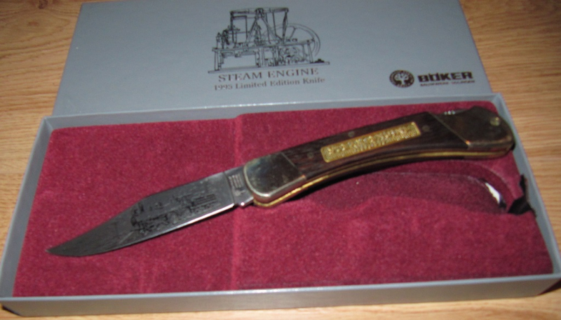 Original BÖKER (Tree Brand) Sammlermesser "Steam Engine", aufgelegt in 1995 zu Ehren der Dampfmaschine und James Watt (Wärmekraftmaschine patentiert im Jahr 1765) . Handmade in Solingen; feststellbares Taschenmesser/ Jagd-/Fahrtenmesser mit vorn geschwungener Klingenform. Arretierende Klinge mit 8cm Klingenlänge. Links in der Klinge ist eine Dampflok eingeätzt/graviert. Für die Sammlung gekauft und nie benutzt. Ab Werk bereits schön scharf geschliffen. Die Klinge blieb all die Jahre unberührt.