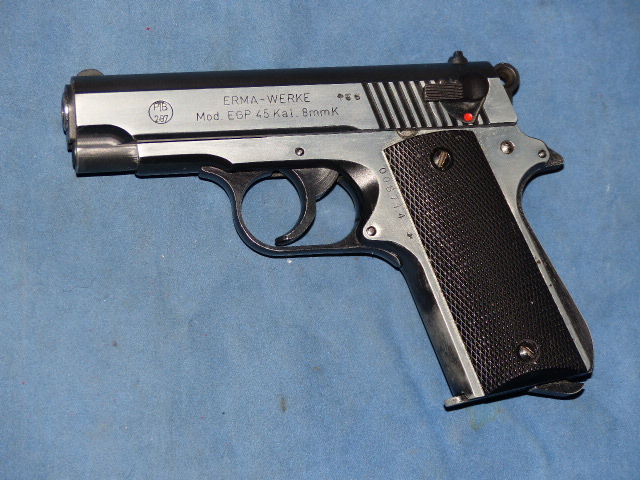 Sammlerstück Erma Pistole Mod. EGP 45 cal. 8mm von 1985, noch ohne Laufschwächung. Die Waffe ist wohl mal überarbeitet worden (siehe Bilder). Funktion ist einwandfrei.
