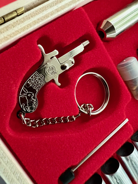 Hier biete ich meine letzte Berloque-Pistole im Kaliber 2 mm Berloque an. Das gute Stück ist ein besonders ausgesuchtes Modell im Holzkasten, das keinerlei Kratzer aufweist und natürlich ungeschossen ist. Auch die Holzkiste habe ich seinerzeit ausgesucht - also ein wirklich perfektes Modell! Der Lieferumfang ist wie auf den Bildern zu sehen vollständig, also die Pistole mit Schlüssenanhänger-Kette und Ring, ein Entladestift, eine Tube mit Platzpatronen (vollständig) und neun Leuchtsterne. Ebenfalls danke ist die mehrsprachige Beschreibung. Gewährleistungsansprüche aller Art sind ausgeschlossen - Privatverkauf. Die Auslieferung erfolgt NUR nach Eingang von Fotos eines gültigen Ausweises (Egun-ID ist davon nicht betroffen) und NUR innerhalb Deutschlands! Viel Spaß beim Bieten!
