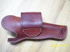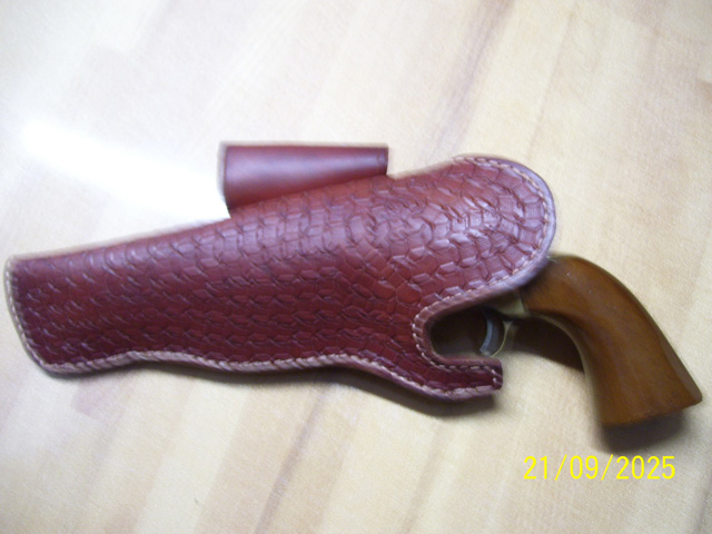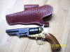 Rücken-Holster Calif. Style, für Colt Sheriff bzw. Colt Police, rotbraun, Vorderseite punziert, Gürtelschlaufe befindet sich auf der Hinterseite für 6 cm Gürtelbreite, Gürtelschlaufe ca. 8 cm Breite, Handarbeit, NEU, Wie genannt, das Holster ist für den Rücken konzipiert. Ich habe es in einem Film gesehen und mußte es gleich entwerfen. Die gezeigte Waffe ist nicht Bestandteil dieser Auktion.