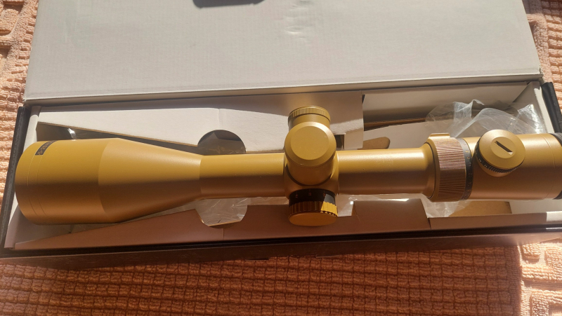 Das ZF wurde nach dem Waffenkauf demontiert und aufwändig sandfarben in Richtung RAL 8000 beschichtet, jedoch mit einem etwas geringeren grün-oliv Anteil. Alle wesentlichen Anzeigen wurden von dem professionellen Beschichter sorgfältig abgeklebt, das Ergenis sichtbar und ohne Mängel einwandfrei ausgeführt. Eine erneute Montage ist nach der Beschichtung nicht mehr erfolgt. Die Erstabdrücke der Ringmontage minimal duch ausspiegeln unter Licht erkennbar, fällt so aber nicht auf. Ehemals für meine HK MR308 angedacht, mit der Zeit ist das Vorhaben eingeschlafen und das Vixen lag nur noch im Schrank.