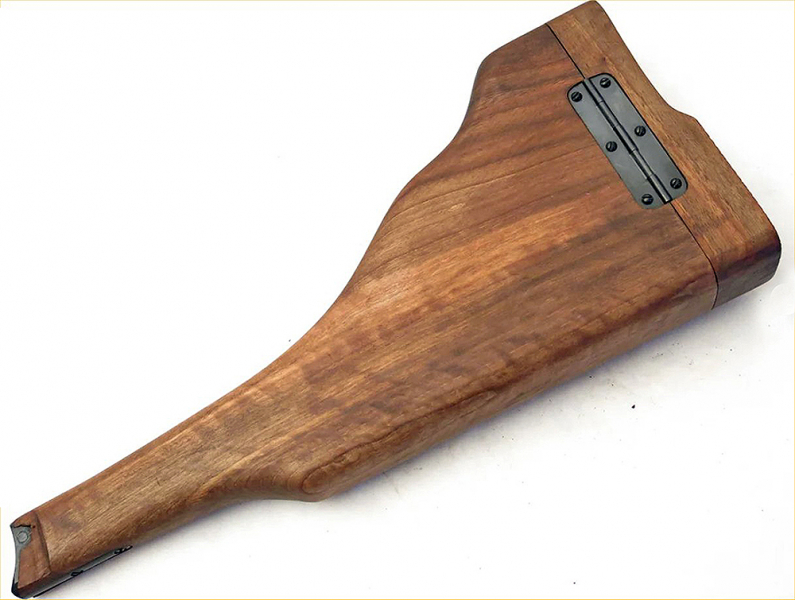 Die perfekte Reproduktion Anschlagkastenholsters aus ausge-suchtem Massivolz und wurde ursprüngloch gefertigt für den Prototyp der P08 Artillerie 1913 Pistole. Hergestellt mit brünierten Stahlbeschlägen wie das Original. Das Holster enthält Reini-gungsstab und einen Schlüssel zum Zerlegen der Waffe.