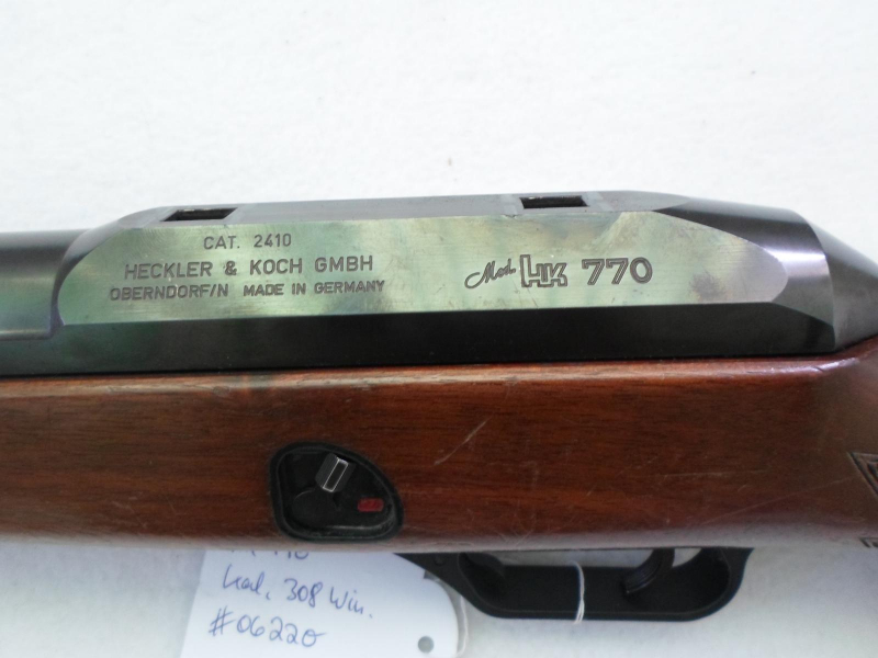 Heckler & Koch HK 770 Selbstladebüchse, gültiger deutscher Beschuß, 2 Schuß Magazin, Lauf blank, Schaftverlängerung, Mündungsfeuerdämpfer, Schaft mit Gebrauchsspuren, Gesamtlänge 114 cm, Schaft / Abzug 37 cm, Lauflänge 58 cm.