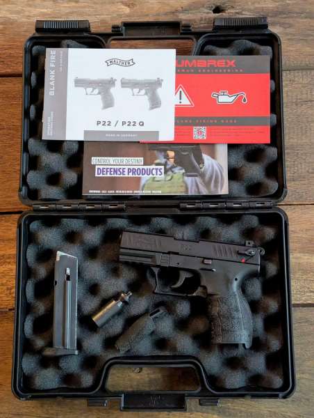 Lieferumfang (wie auf den Fotos zu sehen): Walther P22Q 9mm PAK PTB 778 mit Magazin, zweiter schmalerer Griff zum tauschen (für kleine Hände), Abschussbecher für Signalmunition, Umarex Waffenkoffer, Anleitung.