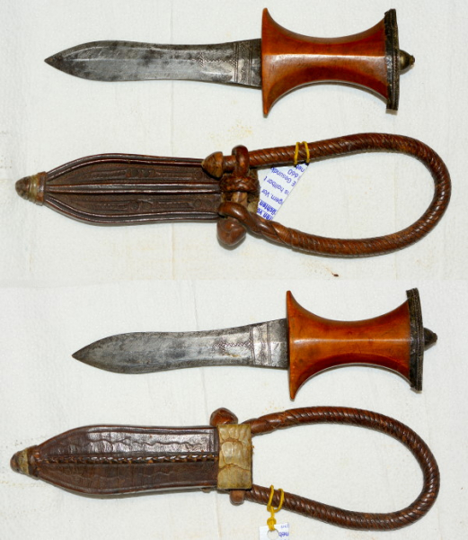 Kleiner Armdolch mit 11,4 cm langer Klinge, auf der Klinge kleine Gravur, komplett mit original Scheide, Nordafrika, Tuarek