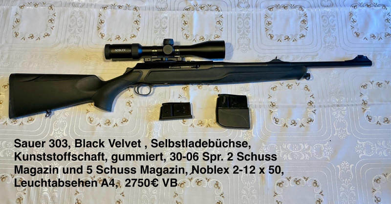 Sauer 303 Selbstladebüchse, Black Velvet, Kunststoffschaft, gummiert, Kal.3006, 2 Schuss und 5 Schuss Magazin, Noblex 2-12 x 50 Leuchtabsehen A4. Weitere Bilder auf Anfrage.