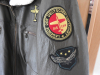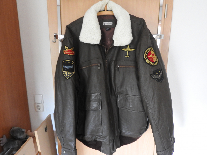 Biete Lederpilotenjacke in braun, Größe XL Die Jacke hat auf der Brust und auf beiden Ärmelt verschiedene Me 109 Patsches sowie die Kennzeichnung Jagdflieger. Die Jacke hat vorn zwei kombinierten Einschub-Pattentaschen, rechts und links auf der Brust zwei Reißverschlusstaschen. Im Inneren befinden sich rechts und links Einschubtaschen. An den Ärmelenden Lederbund mit Druckknopf. Am Ende der Jacke ein brauner Strickbund. Die Jacke hat einen Lederkragen mit einem abnehmbaren Lammfellüberzug (Kunstfell). Verschlossen wird die Jacke mit Reißverschluss. Die Jacke ist innen leicht gefüttert und abgesteppt. Im inneren Rücken ist ein Dreiseitenriss der Me 109 eingestickt. Das Material der Jacke ist Büffelnappaleder.
