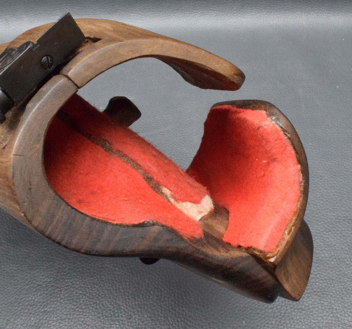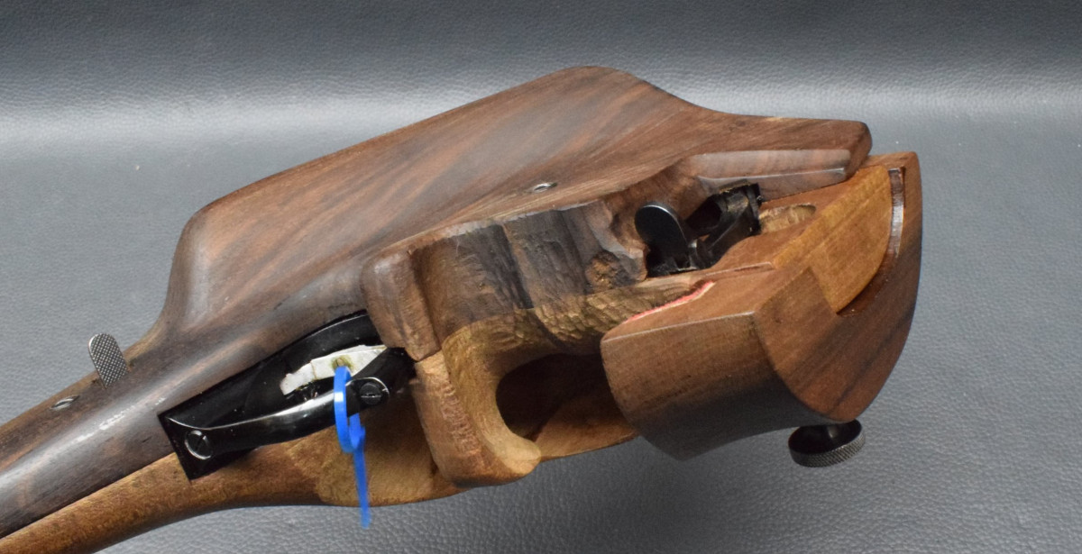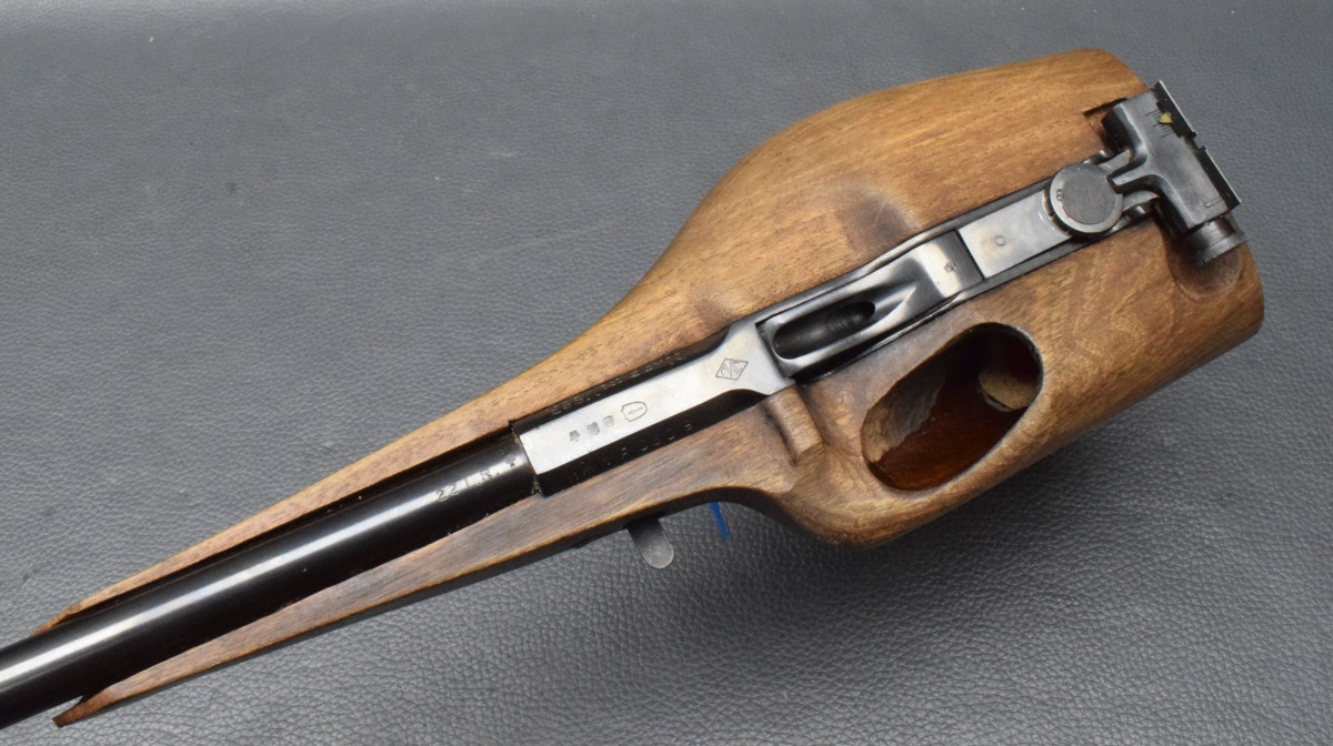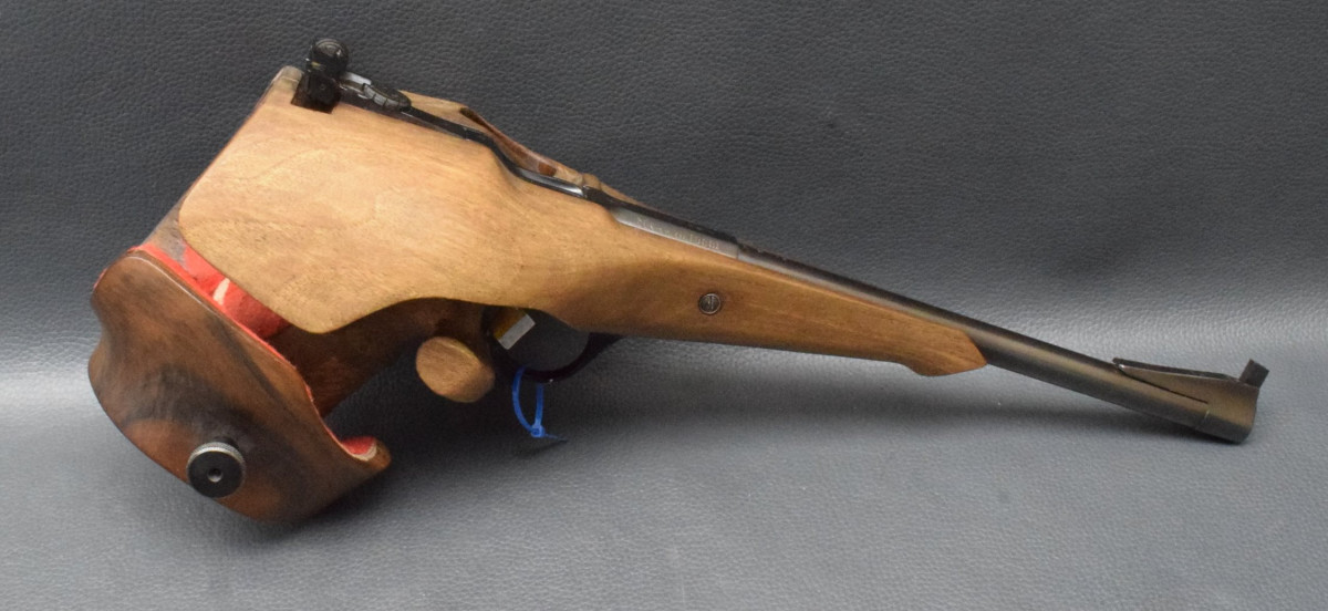unten am Griff liegender Spannhebel, innenliegendem Hahn, einstellbarer Formgriff für Rechtshänder Gr. M. Lauf sehr gut, Brünierung 97% Gebrauchtwaffe, gut