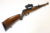 - Nussholzschaft, gummierte Schaftkappe, bayrische Back mit Dreifachfalz, Fischhautverschnitt am Griff & Vorderschaft, Riemenbügel