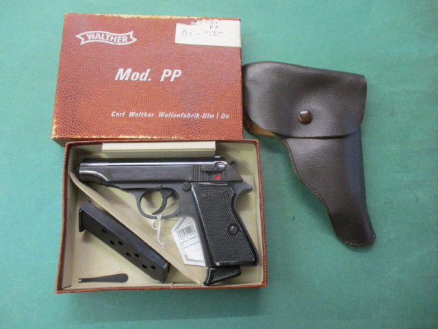 Angeboten wird eine fast neuwertige Pistole Walther PP im Kal. 7,65 Br. incl Tasche , Ersatzmagazin und Verkaufskarton . Lauf top . Versand ins Ausland nur über einen Exporteur .