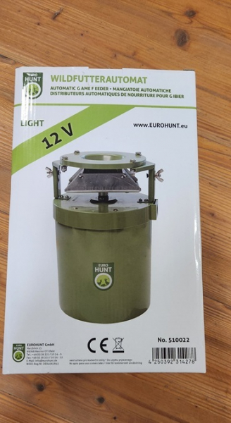 Wild-Futter-Streuautomat mit wetterfestem ABS-Gehäuse, über Digital-Uhr gesteuert, Verteilung (1 bis 6 mal pro Tag), frei programmierbar, Futtermenge (1 bis 60 sec. je Verteilvorgang) programmbierbar, Motorleistung verstellbar zwischen 100%, 75% und 50 %, 24 Stunden-Betrieb (am, pm). 12V Blockbatterie und Solarpanel möglich (Batterie und Solarpanel nicht im Lieferumfang). (Für die Gatterhaltung, beachten Sie bitte die Jagdgesetze).