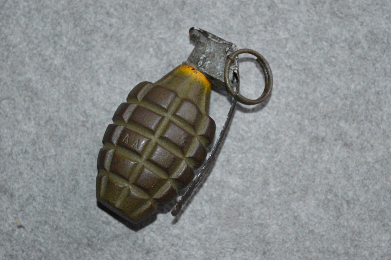 US MKII MK2 Handgranate 2.Weltkrieg original farbe schön gemarkt! löffel stark korrodiert !100% Deko schlag stück mit feder entfernt kein zünder oder sprengstoff enthalten kommt vom Kampfmittel Räumdienst!deswegen garantiert deko!