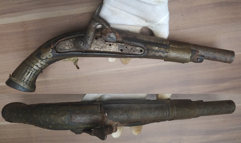 Achtung, das Angebot erfolgt als Schrott vom Kyhber Pass, nicht schußfähiges Deko-Objekt, möglicherweise für den Touristenmarkt aus Teilen zusammengesetzt, ohne historischen Wert! Sie bieten auf den beschädigten, unvollständigen Rest einer Perkussionspistole im Stil von Hindukush-Waffen. Der Lauf gehörte augenscheinlich einmal zu einem Jezail, schweres indo-Persisches Stück einfach rüde zum Pistolenlauf abgesägt, auch die ehemalige Steinschloßplatte dürfte von einem alten Jezail stammen. Der Rest wurde zusammen gezimmert aus den unterschiedlichsten Teilen. Die Pistole ist in dem Zustand in welchem ich sie erhalten habe, sie hat an den Metallteilen starke Alterungsspuren (Flugrost/Rostnarben). Noch einmal: Das Angebot erfolgt ausdrücklich als grausiger Schrott vom Kyhber Pass, nicht schußfähiges Deko-Objekt, möglicherweise für den Touristenmarkt aus Teilen zusammengesetzt, ohne historischen Wert! Die Photos ergänzen die Artikelbeschreibung. Die Versandkosten von 6,19 Euro (DHL, Paket) trägt der Erwerber. Kein Internationaler Versand, versendet wird nur innerhalb Deutschlands. Keine Rückgabe, kein Umtausch, keine Nachverhandlungen. Der Verkauf erfolgt als Privatperson, unter Ausschluß der Garantie und der Gewährleistungsrechte. Bieten Sie bitte nur, wenn Sie damit einverstanden sind. Stellen Sie Fragen bitte vor Gebotsabgabe, wenn sie sich unsicher sind, ob sie den Artikel wirklich erwerben wollen, bieten Sie bitte nicht mit, bei Spaßbietern verstehe ich keinen Spaß.