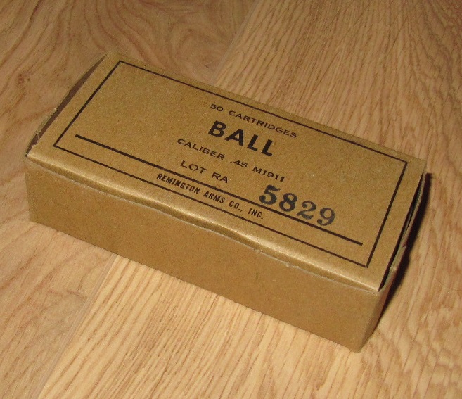 1 historische Packung mit 50 Patronen REMINGTON Kal.45ACP (klassisch mit VM-Rundkopf) aus Nachlass. Neuware ohne Lagerspuren, in top-erhaltener Papp-Packung. Die Patronen sind wie neu, ohne angelaufene Stellen oder andere Fehler im Messing. Wurden all die Jahre dunkel, trocken und kühl gelagert. Gefertigt 1961 (Bodenstempel), ganz in einfacher, schmuckloser Karton-Papp-Verpackung, genau wie sie auch schon im Krieg üblich war.