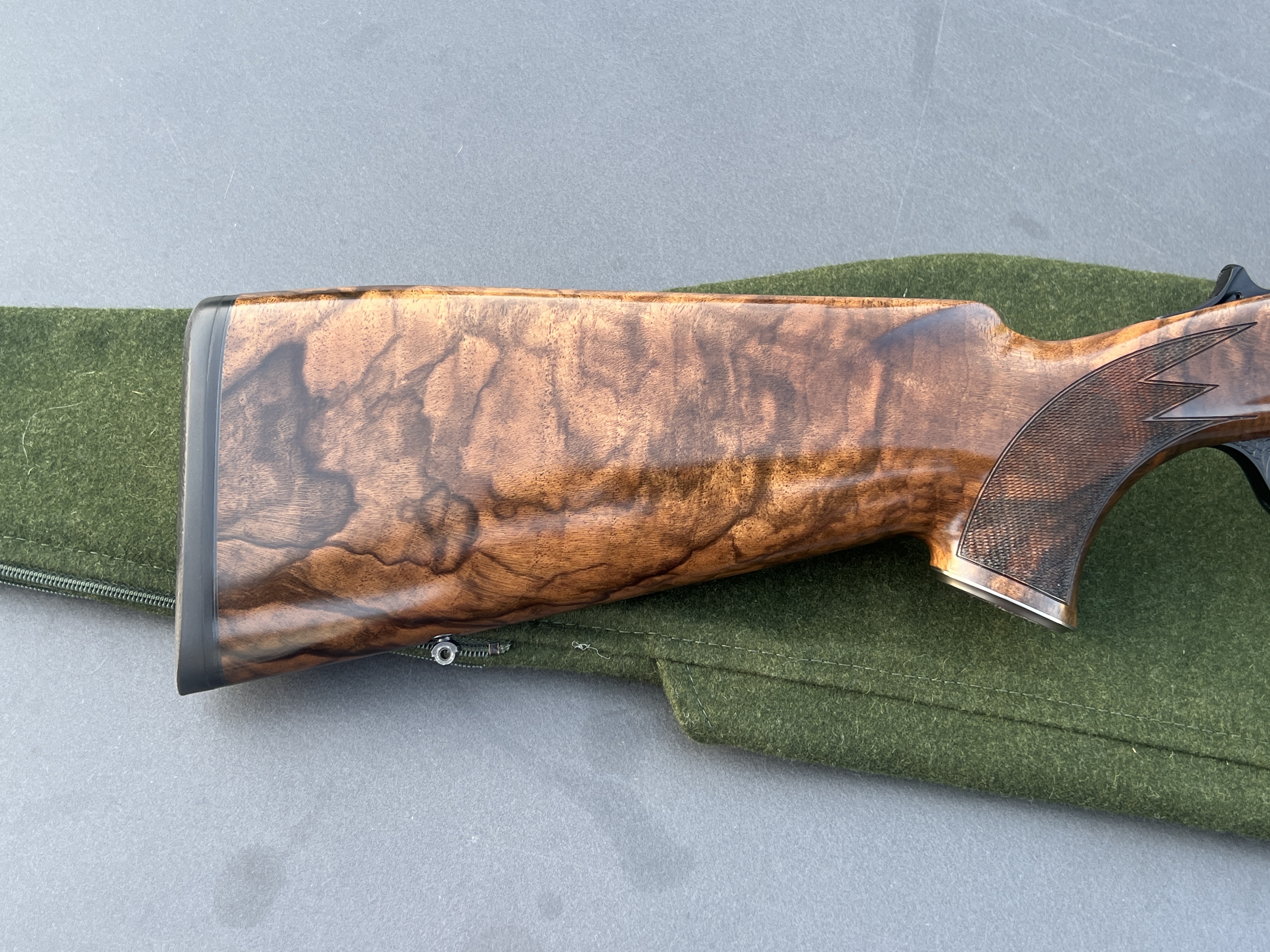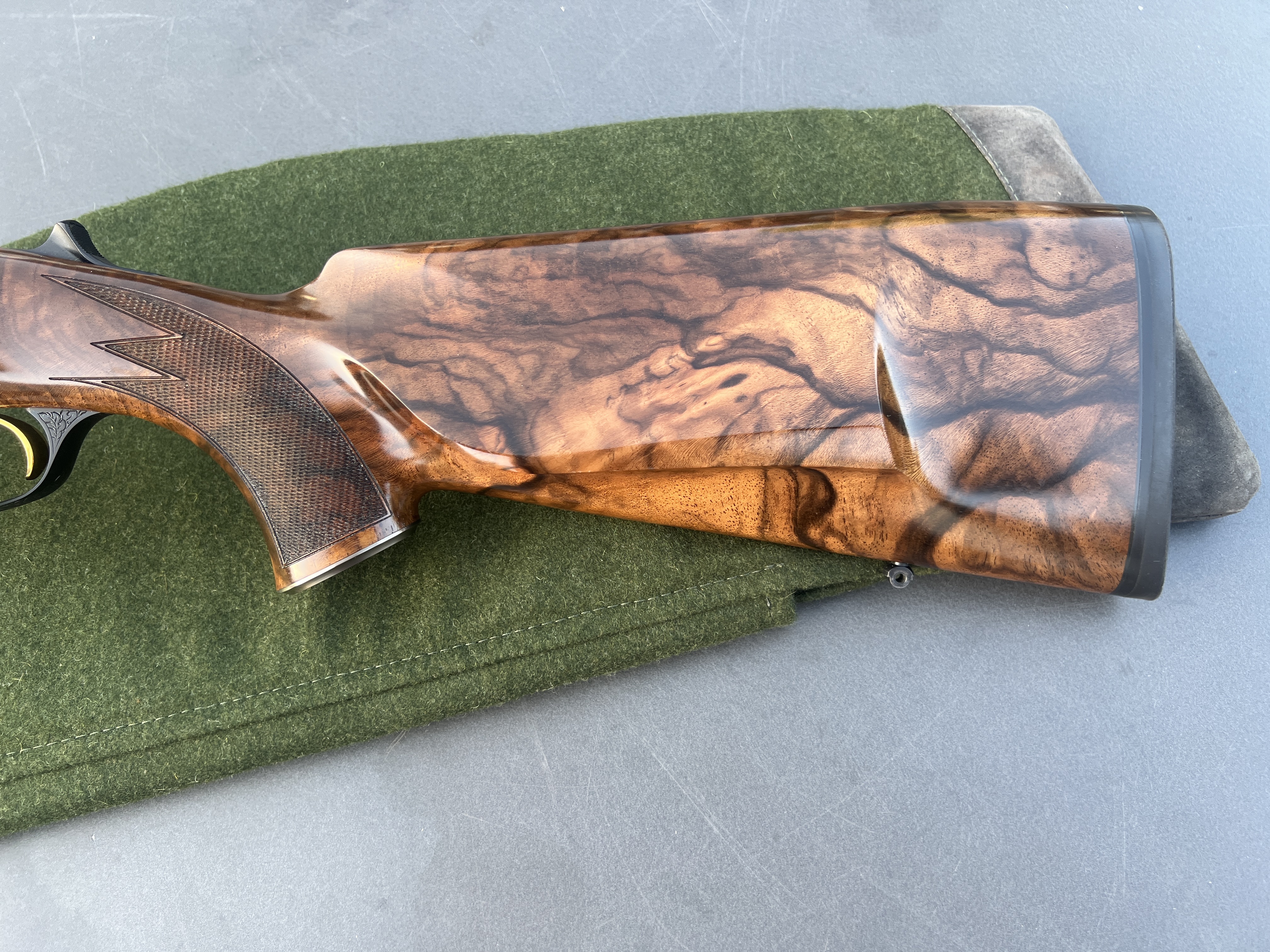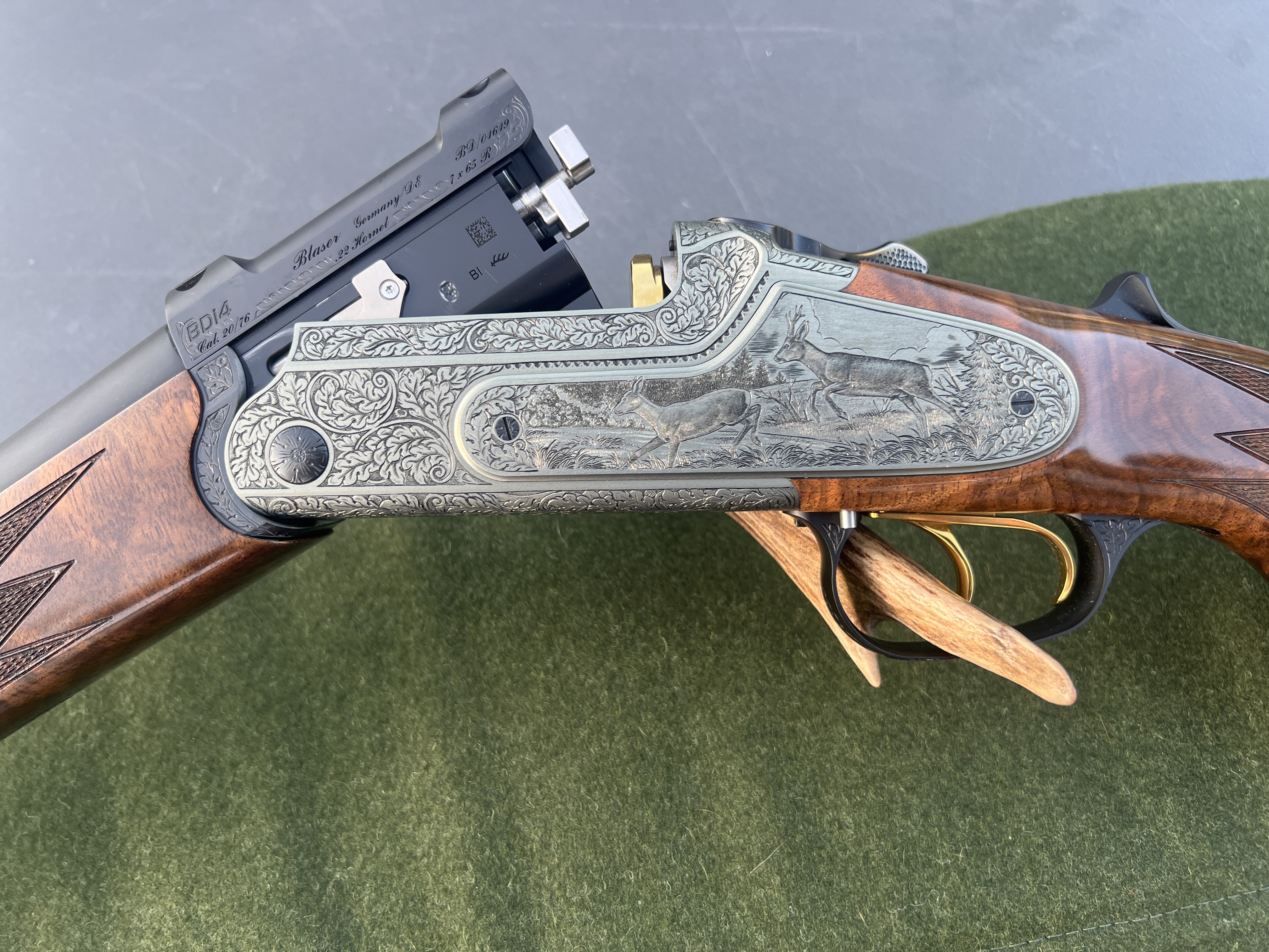 Sie steigern auf einen unbenutzten, voll funktionsfähigen und makellosen Blaser Bockdrilling BD14 Custom Grade 1 aus dem Custom Shop von Blaser. Der Bockdrilling war auf der Homepage von Blaser veröffentlicht. Es ist alles original Blaser und unverändert. Ich bezeichne den Drilling als neuwertig, lediglich da ich der erste Besitzer bin. Faktisch ist er neu und unbenutzt und war seit dem Kauf ausschließlich in meiner Sammlung im Schrank. Die oberste Holzklasse des Schafts ist klar ersichtlich. Abzüge und Verschlussblock ist goldfarben. Der Gravurstil ist Flachstichgravur mit Motiv Rehwilf/Fuchs und Hase. Die Laufwurzel ist ebenfalls graviert. Die Füllungen sind Eichenlaub, das Pistolengriffkäppchen mit Motiv Krähe und ausgebreiteten Schwingen. Standardschaftmaße. Kaliber große Kugel: 7x65R, kleine Kugel: .22 Hornet und Schrotlauf: 20/76. Top Schussleistung bei Abholung von Blaser. Beide Kugelläufe schossen auf 100 Meter harmonisch und thermostabil ineinander. Der BD 14 hat eine Klappkimme. NP heute über 20T€. Verkauf aufgrund Auflösung der Sammlung. EWB erforderlich. Die Versandkosten beziehen sich auf innerdeutschen Versand mit Waffenkurier. Verkauf ins Ausland nur über deutschen Exporteur, wie zB Waffen Bock (bitte vor Kauf abklären). Es handelt sich um einen Privatverkauf. Viel Spaß beim Steigern...