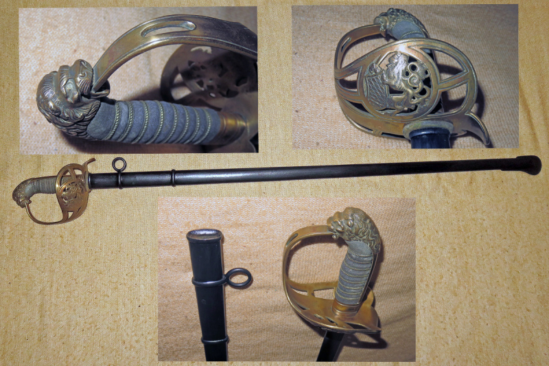 Das Messingbügelgefäß hat das bayerische Wappen mit stehendem Löwen im Korb, wobei der Griff aus Fischhautbesatz, Drahtwicklung und Löwenkopfknauf besteht.