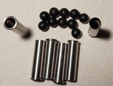 6 Hülsen Edelstahl Kaliber 38 für 8 mm Knall, 34 mm lang inkl. 10 Gummikugeln 9 mm