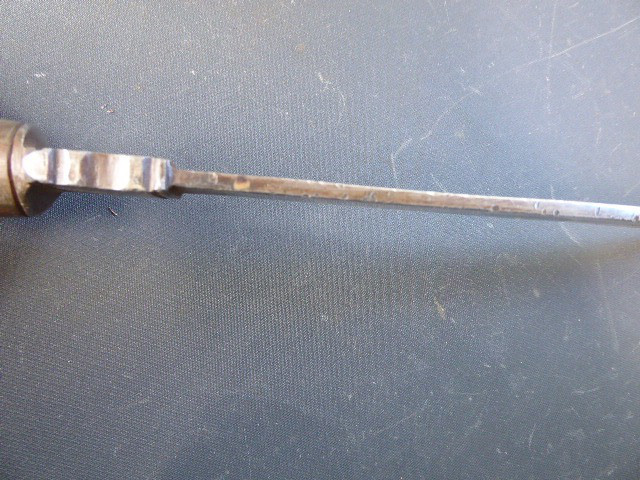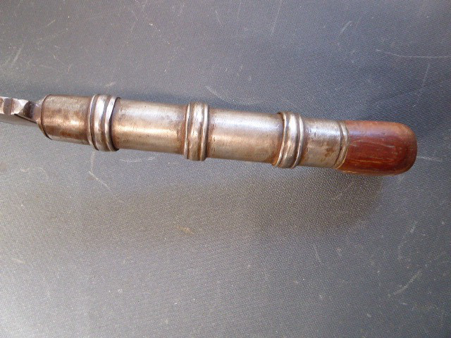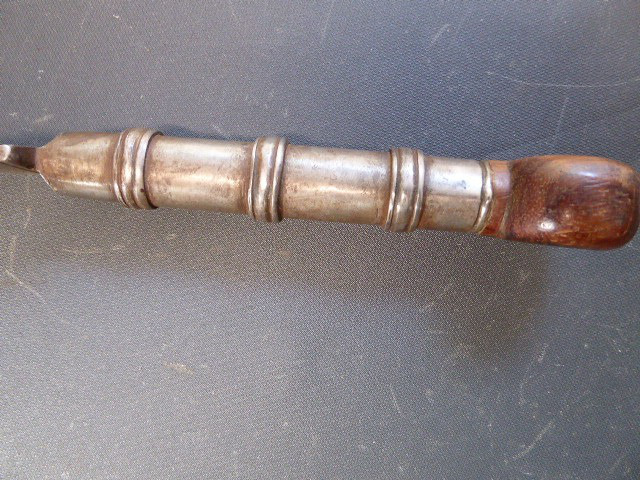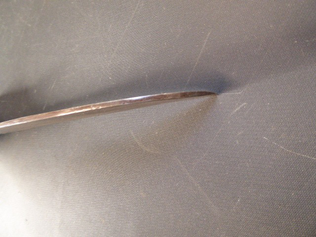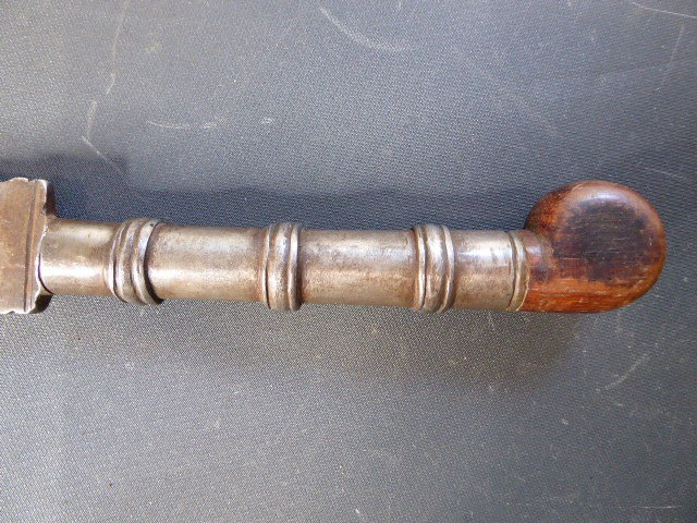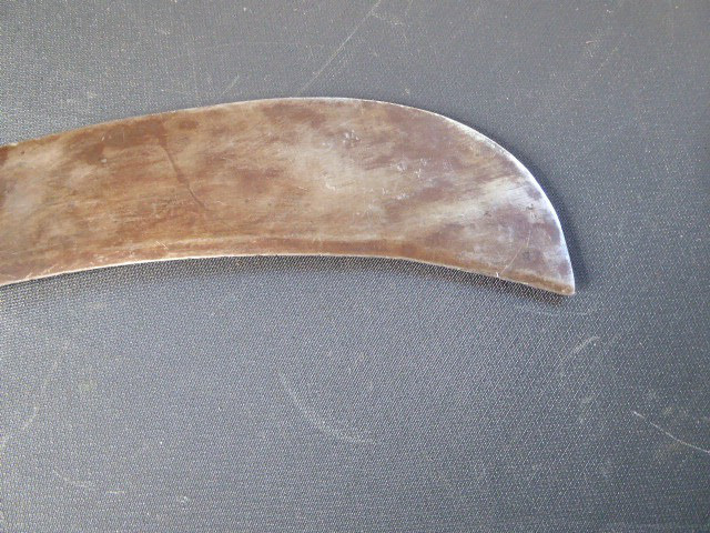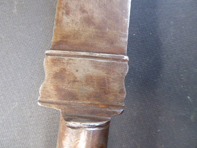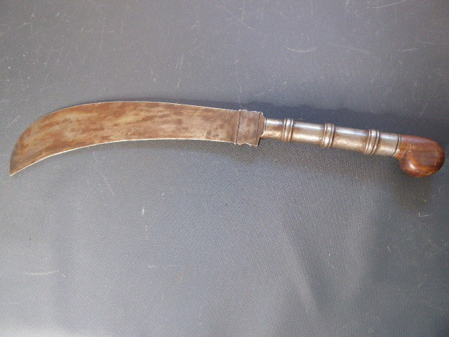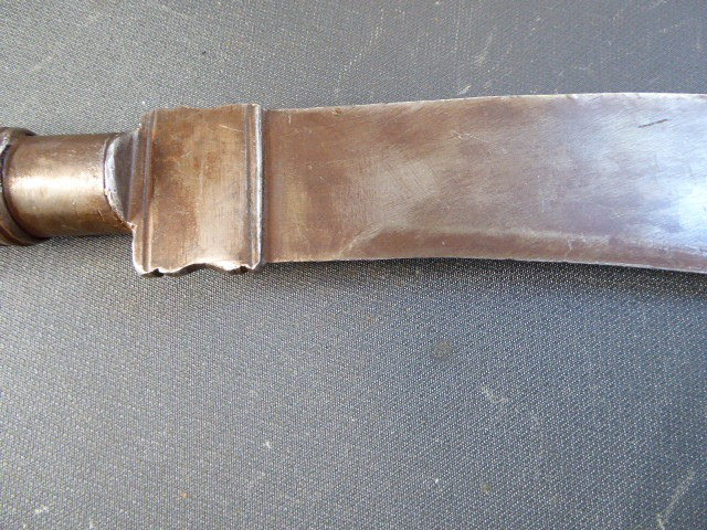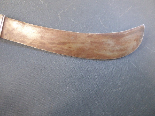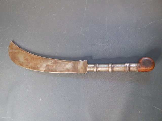Aus meiner Sammlung gebe ich, eine altes Seltenes Indisches Moplah Schwert ab. Kenner werden es sicherlich wissen aus welcher Zeit das Teil stammt. Griff Metall mit drei Ringen und Holzknauf. Ein sehr Stabile gekrümmter Klinge, nach Innen scharf. Alles im Guten Sammelwürdigen Zustand. Alles andere entnehmen Sie Bitte den Fotos. Gesamtlänge: 46,5 cm, Klingenlänge: 29,5 cm, Blattbreite: 3,6 - 5,4 cm. Kann zu jederzeit bei mir besichtigt werden. Privatauktion keine Rücknahme und Garantie.