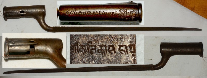 Tüllenbajonett, englische Kolonialtruppe in Indien, die Verriegelung erfolgt über eine Feder, Tüllen-Innendurchmesser 24,9mm, Klingenlänge 40cm, Dreikantklinge ohne Sicken, auf der Tülle indischer Tiger und Schrift in Sanskrit, auf der Klinge ebenfalls Schriftzeichen