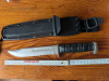 Verkaufe aus Verlassenschaft ein tolles Messer. Gebrandet mit "Commando", stainless 440. Die Maße siehst du auf dem Foto. Das Messer sieht wenig benutzt aus. Klinge nicht verschliffen, Klinge und Sägezahnung scharf. Tatsächliche Gebrauchsspuren sieht man eigentlich nur am Abschlussknauf des Hefts - und diese sind meiner Meinung nach altersbedingte Abplatzungen. Am Heftabschluß hat das Messer auch eine Fangriemenöse. Die Scheide ist aus Kunststoff, sieht ziemlich martialisch aus mt dem Schenkelriemen und der Sicherungslasche. Für die Einhaltung evtl. Sicherheitsbestimmungen im Land des Käufers ist der Käufer verantwortlich! Wie immer hier: keine Garantie, keine Gewährleistung, keine Rüchnahme. Das Porto bezieht sich auf Österreich, ins Ausland gehts nach dem Tarifrechneer der österr. Post, versicherter Versand natürlich.