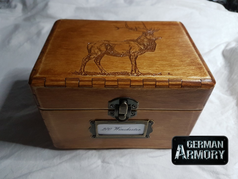 Unsere Munitionskisten sind ja hinlänglich bekannt. Wir wurden von vielen Kunden angesprochen die sich noch etwas mehr gewünscht haben. Darum haben wir diese "deluxe" Variante der Boxen entwickelt. Die Boxen sind mit einem Klappdeckel versehen. Sie sind sowohl von innen wie auch außen lackiert. Genauer gesagt werden sie 2 mal lackiert und 3 mal geölt. Dazwischen noch mal geschliffen um einen Vintagelook zu erzeugen. Die Passungen der Bohrungen für die Munition sind extra eng, außerdem hängen die Patronen bzw. die Geschosse frei in der Luft und haben keinen Kontakt zur Kiste. Es werden die Deckel innen wie außen mit Motiven Ihrer Wahl versehen. Bitte nehmen Sie bei Interesse Kontakt zu uns auf und sehen Sie sich für mehr Motivvorschläge auch unsere anderen Laserarbeiten an.