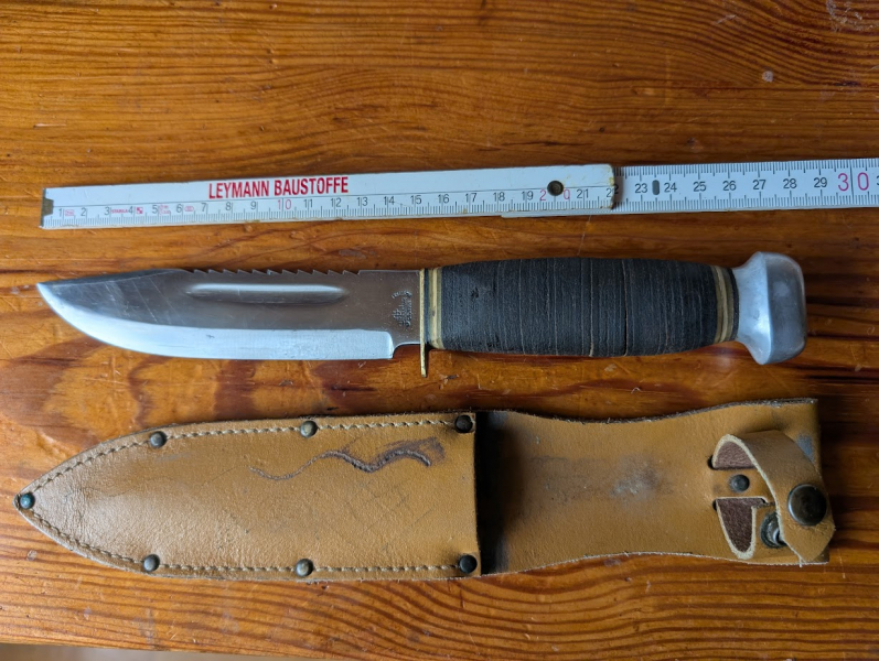 Verkaufe aus Verlassenschaft ein tolles Bowie-Messer. Eher seltenes Modell Nr. 50.176.LE20 von Hubertus, Solingen mit Lederscheibengriff und Rücken-Sägezahnung. Die Maße siehst du auf dem Foto. Das Messer sieht wenig benutzt aus. Klinge nicht verschliffen und scharf. Die Scheide ist nicht mehr sehr schön aber noch zu gebrauchen. Für die Einhaltung evtl. gesetzlicher Sicherheitsbestimmungen im Land des Käufers ist der Käufer verantwortlich! Wie immer hier: keine Garantie, keine Gewährleistung, keine Rüchnahme. Das Porto bezieht sich auf Österreich, ins Ausland gehts nach dem Tarifrechneer der österr. Post, versicherter Versand natürlich.