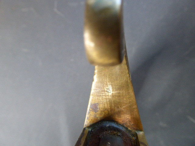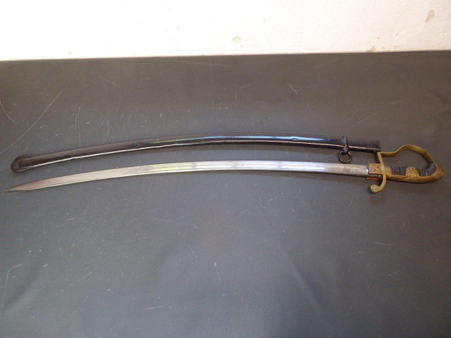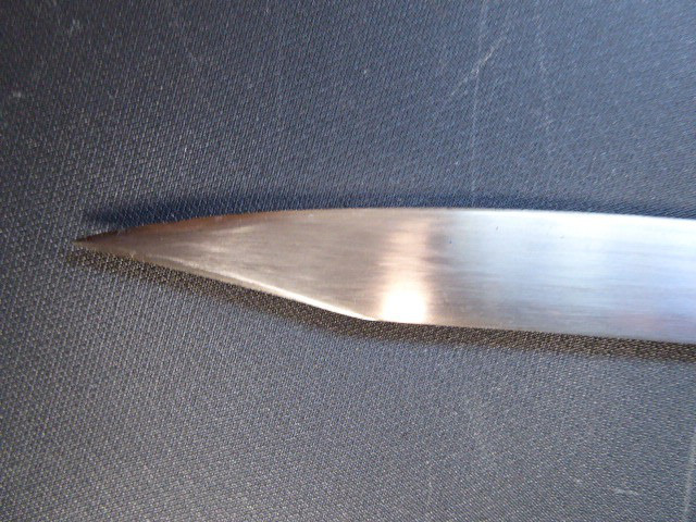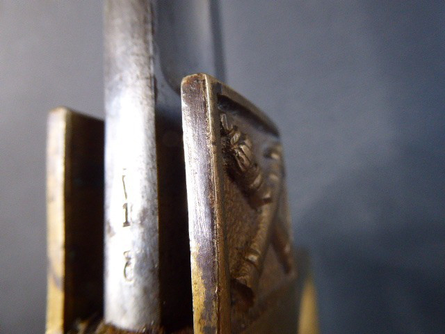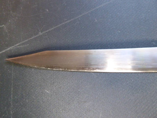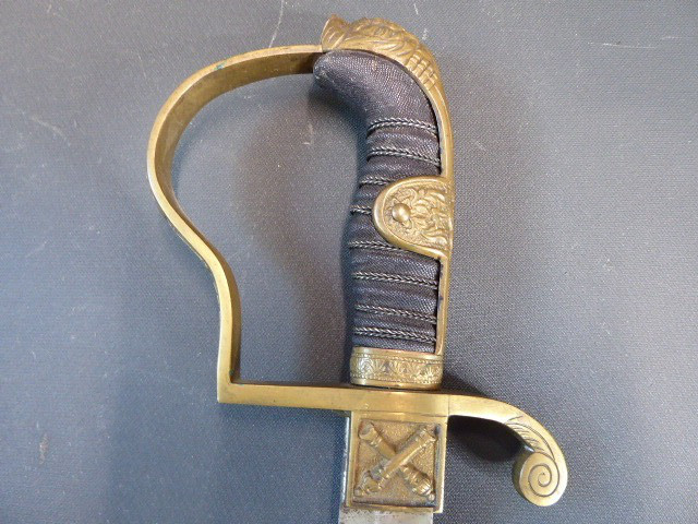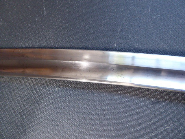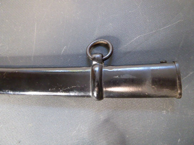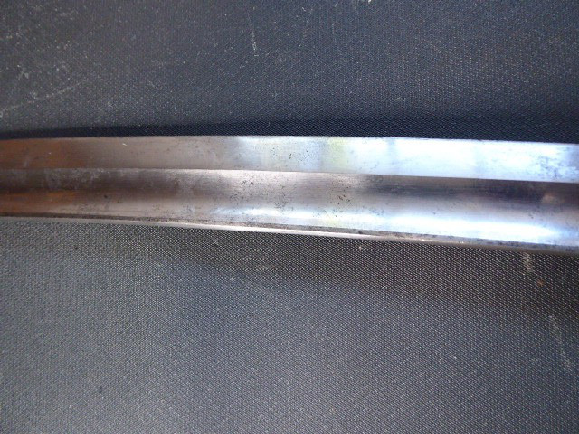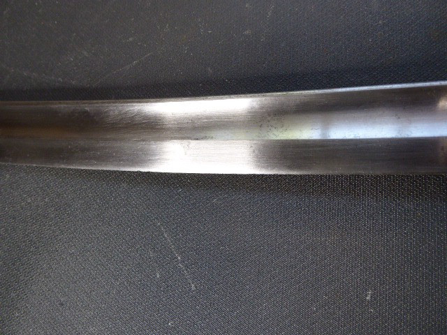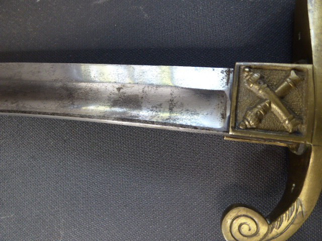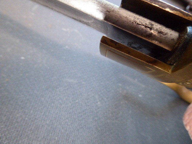 Aus meiner Sammlung gebe ich, ein alten Artillerie Wachtmeister Säbel Kammerstück in Seltener Ausführung, Scheide und Hersteller ab. Griff Holz mit Fischhaut ummantelt und zweifacher Drahtwicklungen. Ser großes Gefäß aus Messing mit Löwenkopf Kappe, alles mit Kammerstempel. Einschneidige breite und stark gekrümmte Klinge mit Panduren Spitze, beidseitig mit einer Kehlung, der Rücken W unter Krone und Punze, auf der Fehlschärfe Hersteller ALEX KOPPEL SOLINGEN. Scheide mit einem Tragering, auf dem Schlepper Kammerstempel, Scheide wurde mal Nachlackiert mit einigen kleinen Dellen und es fehlt eine kleine Schraube. Ein Selten Großer und breiter Säbel. Das Teil ist im Guten Sammelwürdigen Zustand. Alles andere entnehmen Sie Bitte den Fotos. Gesamtlänge: 101,5 cm, ohne Scheide: 98,5 cm, Klingenlänge: 84,7 cm, Klingenbreite: 3 cm. Kann zu jederzeit bei mir besichtigt werden. Privatauktion keine Rücknahme und Garantie.
