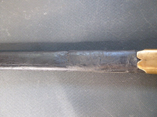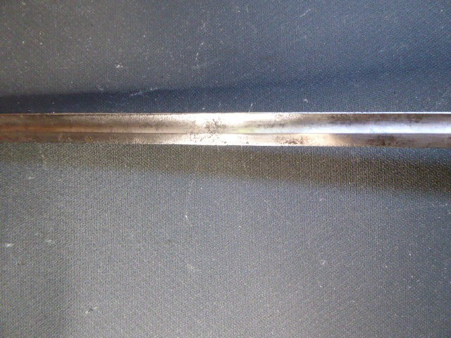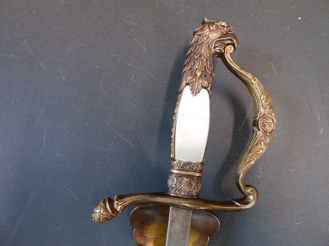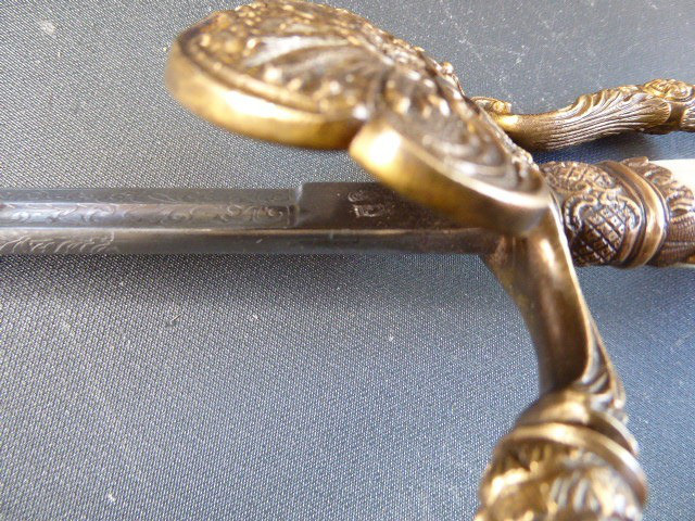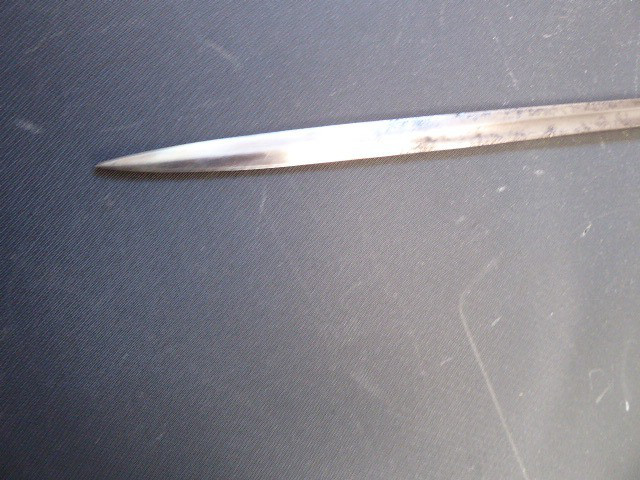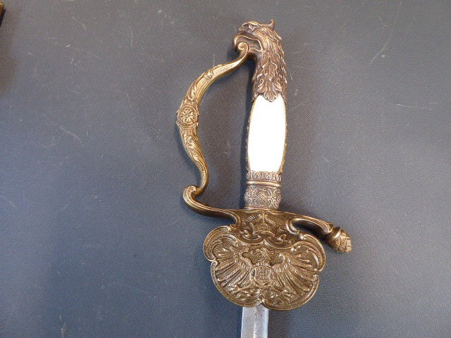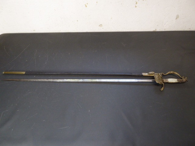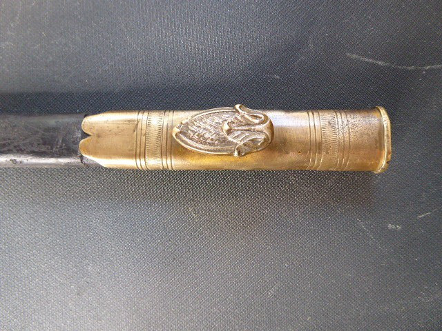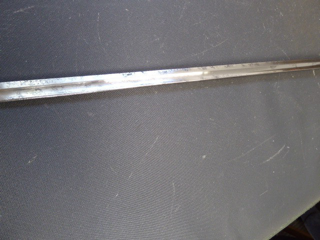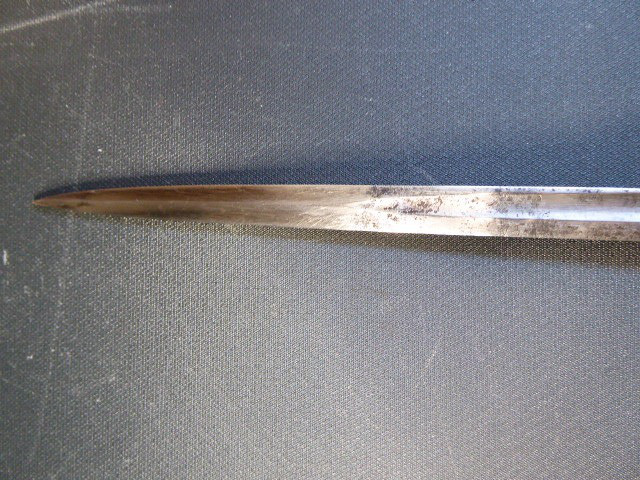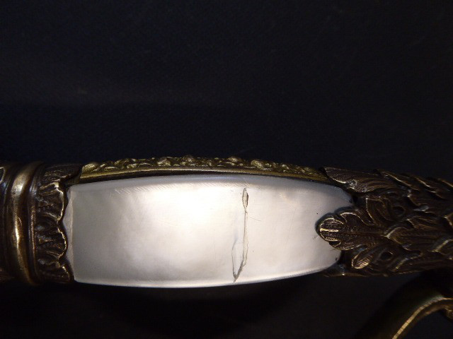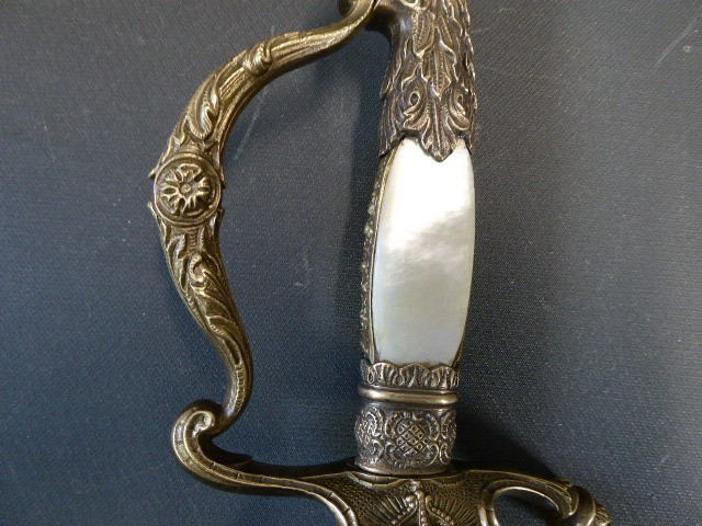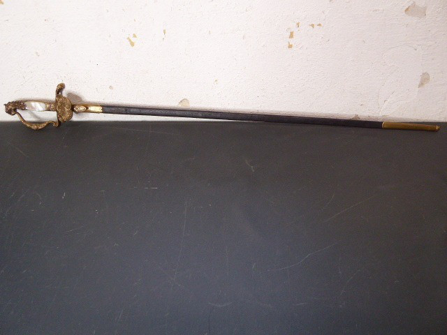 Aus meiner Sammlung gebe ich, ein alten langen Preuß. Hofbeamten Degen mit Adlerkopf Lederscheide und Hersteller WKC ab. Griff Holz mit Perlmutt Schalen, stark verziertes Gefäß aus Messing mit Adlerkopf Knauf. Einschneidige Klinge beidseitig mit einer Kehlung und Ätzungen, auf der Fehlschärfe Hersteller WKC unter Königskopf und Ritterhelm. Scheide Leder oben mit kleiner Reparaturstelle und zwei Messingbeschläge. Das Teil ist im Guten Sammelwürdigen Zustand. Alles andere entnehmen Sie Bitte den Fotos. Gesamtlänge: 103 cm, ohne Scheide: 100 cm, Klingenlänge: 86,8 cm, Klingenbreite: 1,6 cm. Kann zu jederzeit bei mir besichtigt werden. Privatauktion keine Rücknahme und Garantie.