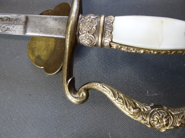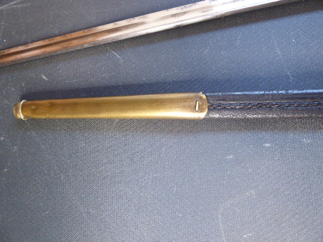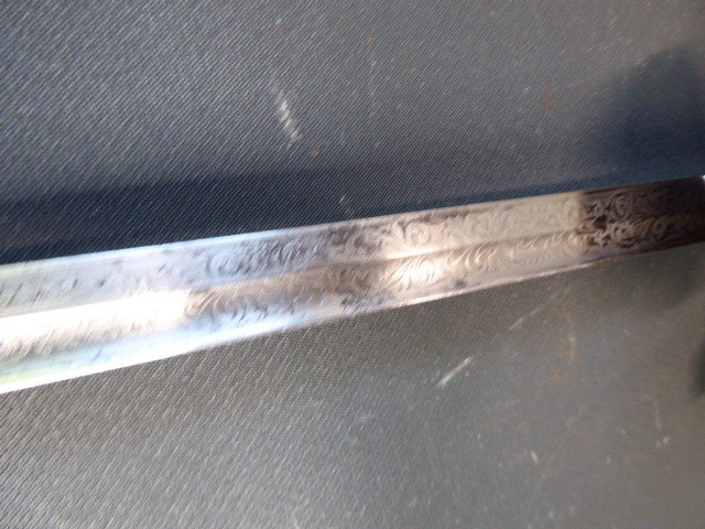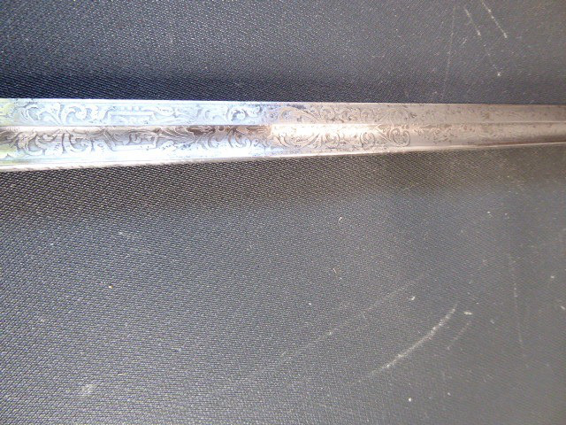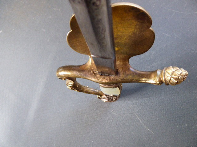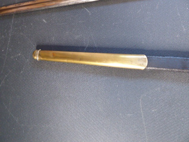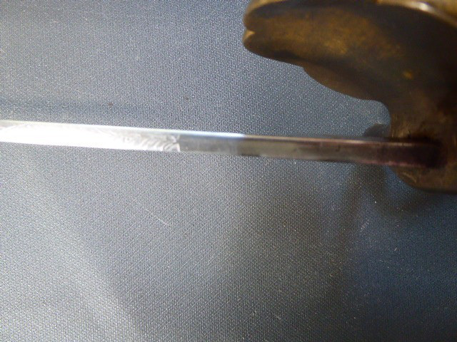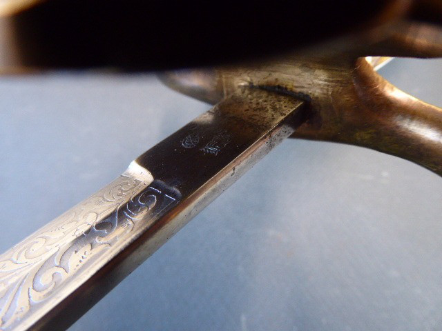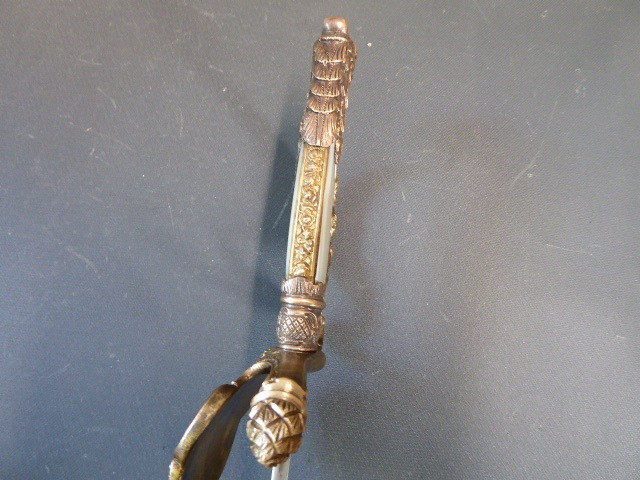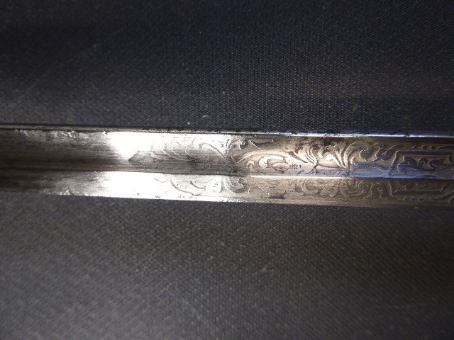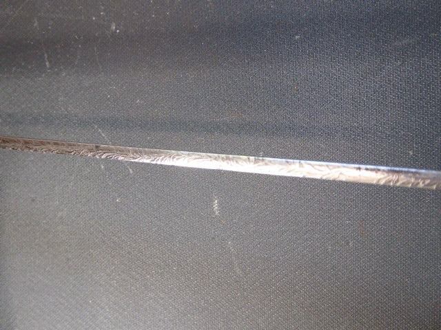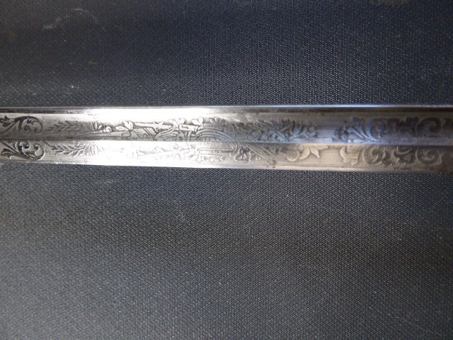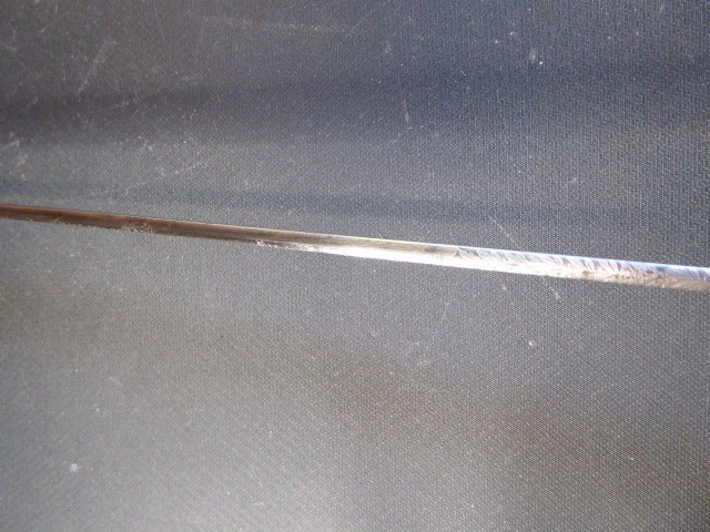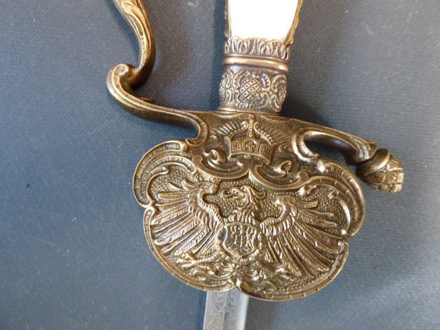 Aus meiner Sammlung gebe ich, ein alten langen Preuß. Hofbeamten Degen mit Adlerkopf Lederscheide und Hersteller WKC ab. Griff Holz mit Perlmutt Schalen, stark verziertes Gefäß aus Messing mit Adlerkopf Knauf. Einschneidige Klinge beidseitig mit einer Kehlung und Ätzungen, auf der Fehlschärfe Hersteller WKC unter Königskopf und Ritterhelm. Scheide Leder oben mit kleiner Reparaturstelle und zwei Messingbeschläge. Das Teil ist im Guten Sammelwürdigen Zustand. Alles andere entnehmen Sie Bitte den Fotos. Gesamtlänge: 103 cm, ohne Scheide: 100 cm, Klingenlänge: 86,8 cm, Klingenbreite: 1,6 cm. Kann zu jederzeit bei mir besichtigt werden. Privatauktion keine Rücknahme und Garantie.