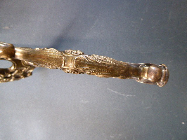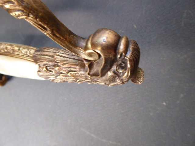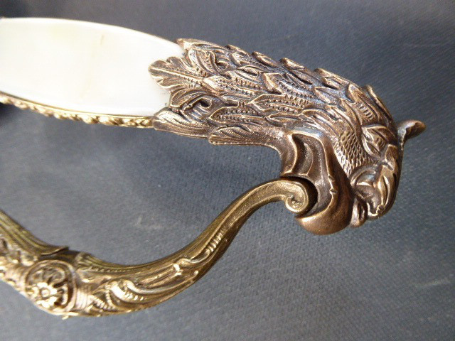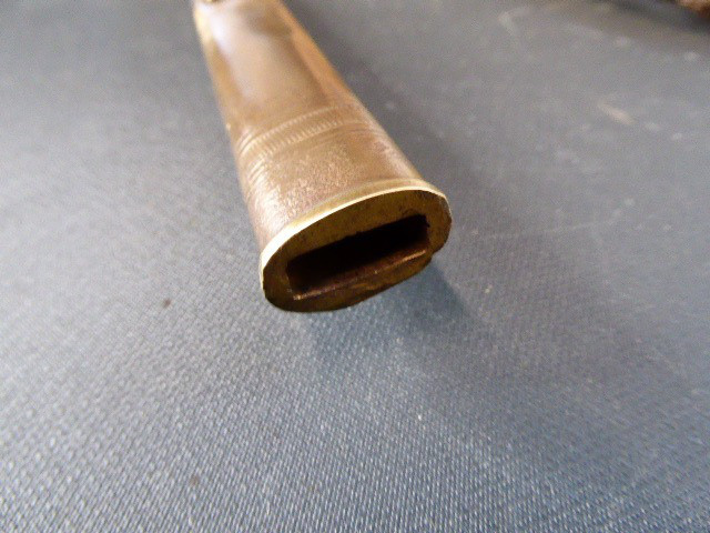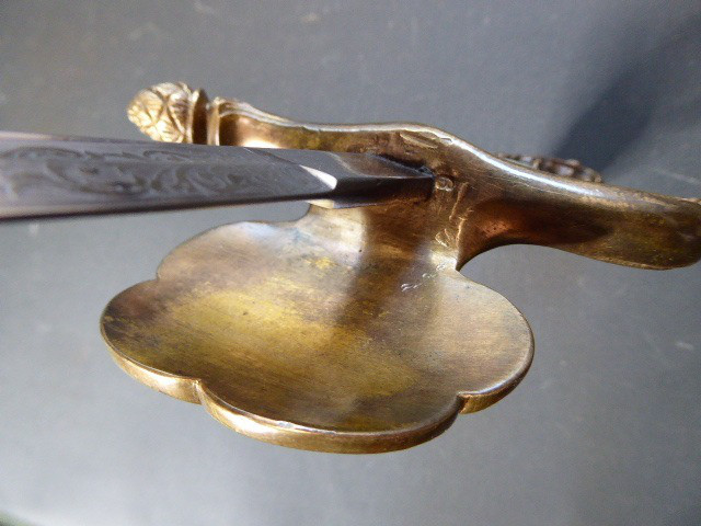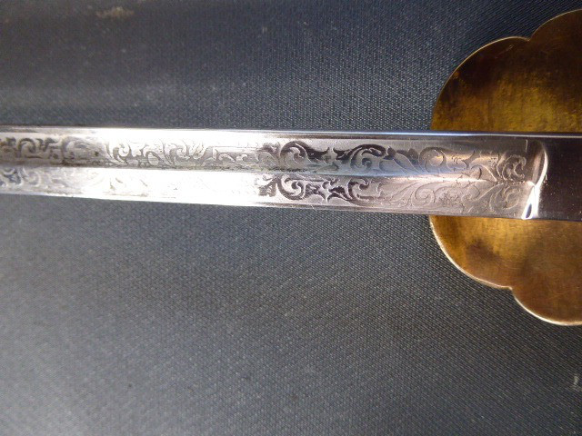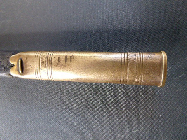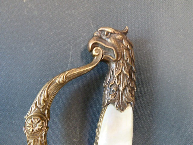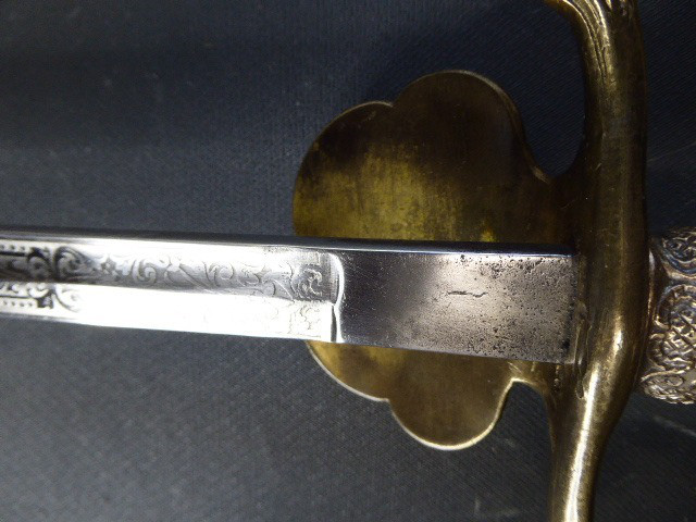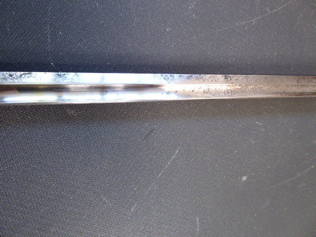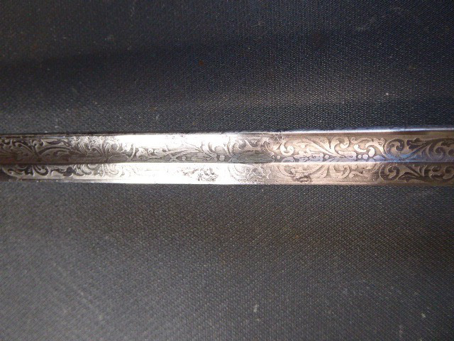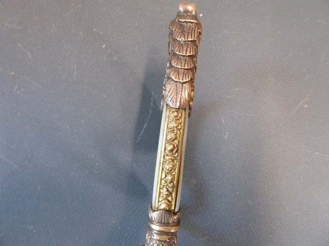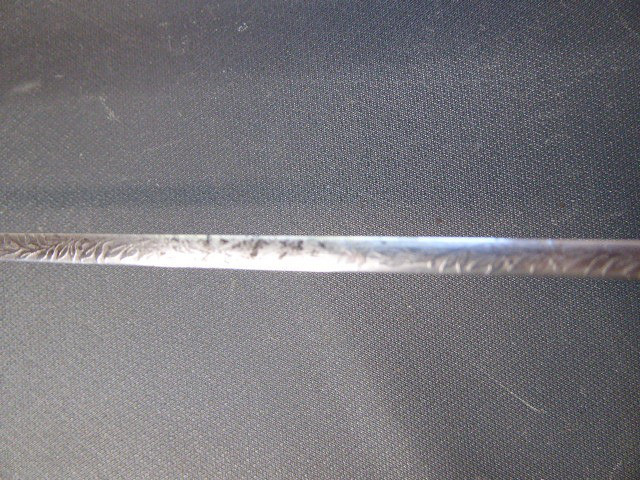 Aus meiner Sammlung gebe ich, ein alten langen Preuß. Hofbeamten Degen mit Adlerkopf Lederscheide und Hersteller WKC ab. Griff Holz mit Perlmutt Schalen, stark verziertes Gefäß aus Messing mit Adlerkopf Knauf. Einschneidige Klinge beidseitig mit einer Kehlung und Ätzungen, auf der Fehlschärfe Hersteller WKC unter Königskopf und Ritterhelm. Scheide Leder oben mit kleiner Reparaturstelle und zwei Messingbeschläge. Das Teil ist im Guten Sammelwürdigen Zustand. Alles andere entnehmen Sie Bitte den Fotos. Gesamtlänge: 103 cm, ohne Scheide: 100 cm, Klingenlänge: 86,8 cm, Klingenbreite: 1,6 cm. Kann zu jederzeit bei mir besichtigt werden. Privatauktion keine Rücknahme und Garantie.