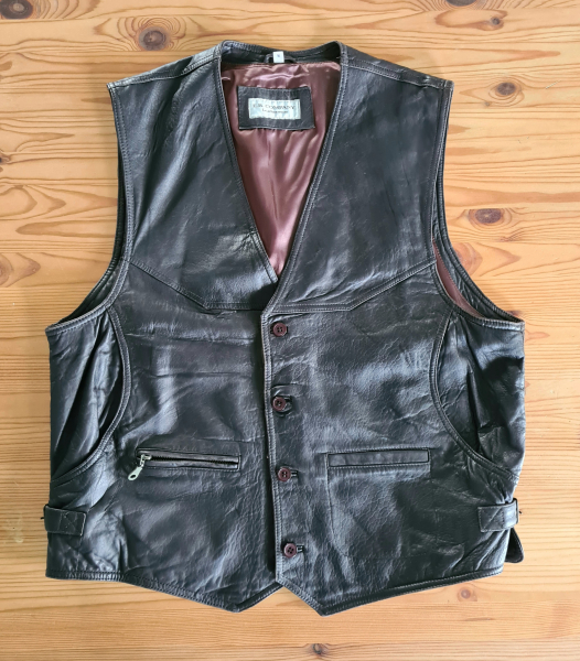 Ältere Weste für Herren aus dunkelbraunem & weichem Echtleder in Größe 56 - gebraucht und in gutem Zustand.