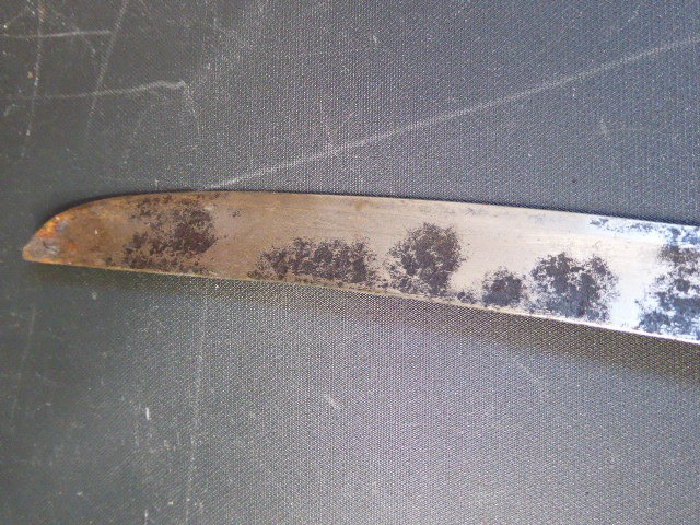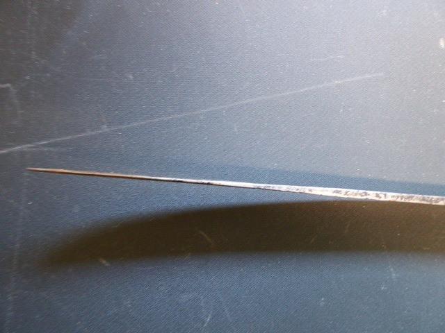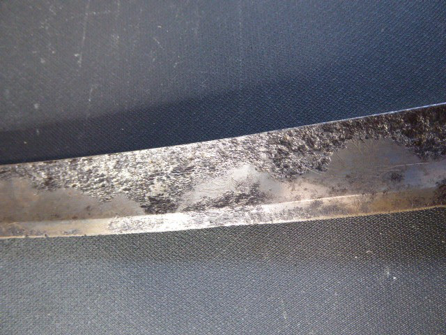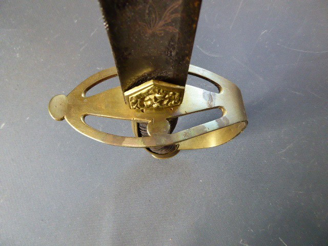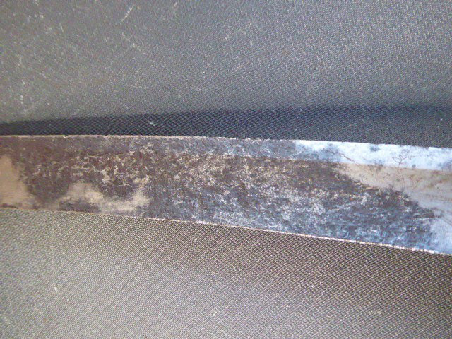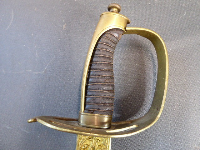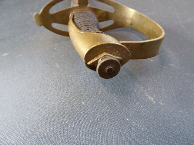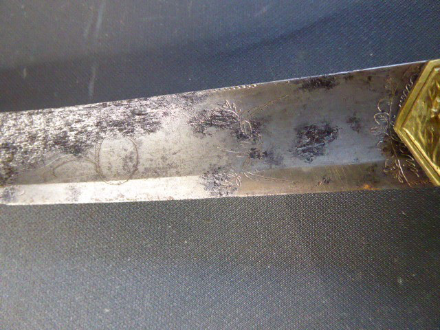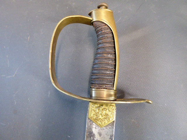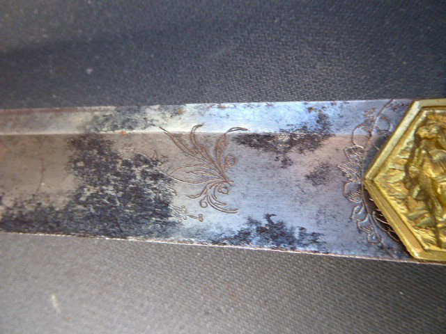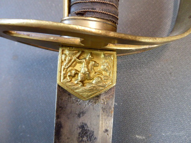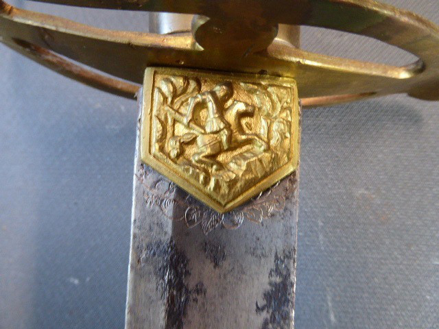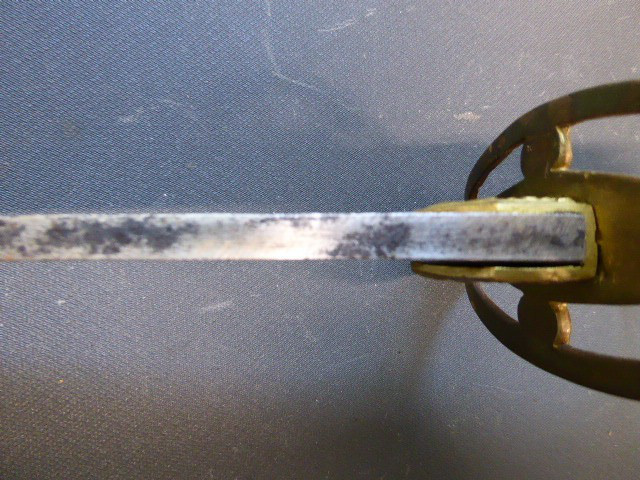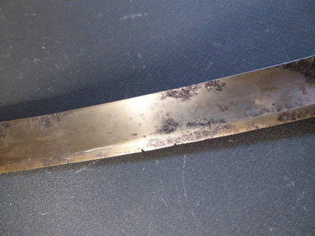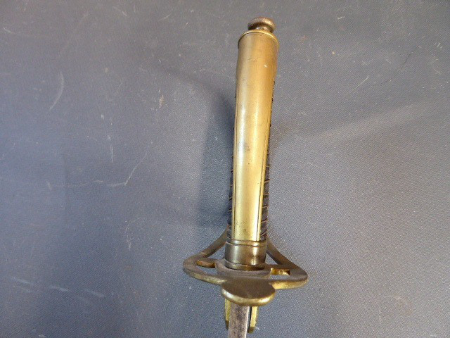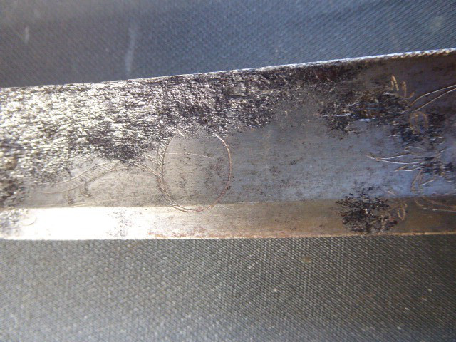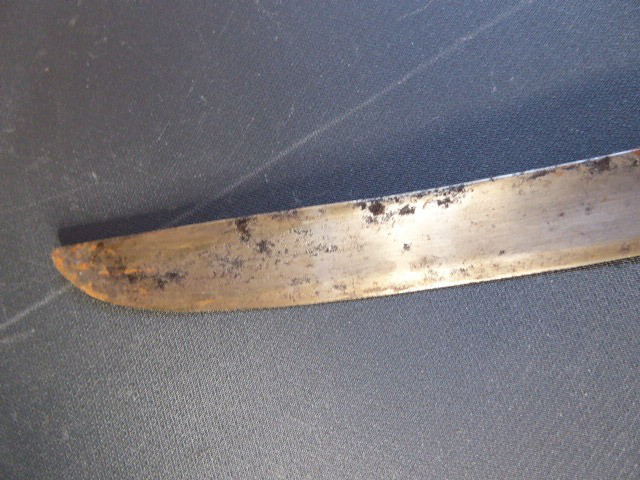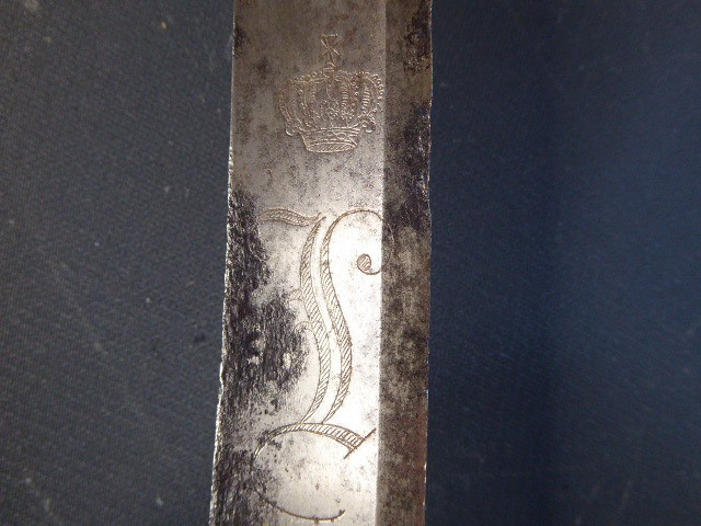 Aus meiner Sammlung gebe ich, ein alten Unbekannten Säbel Bayern? ohne Scheide mit breiter Klinge ab. Kenner werden es sicherlich wissen wo das Teil einzuordnen ist. Griff Holz mit Leder ummantelt und einer Drahtwicklung. Gefäß Messing mit einem Bügel und Messing Kappe. Parier Lappen beidseitig mit Stark geprägten Reiter Zehnen. Breite Einschneidige Klinge, beidseitig mit breiten Kehlungen, Initialen und Ornamenten geschnitten, Klinge Teilweise mit Starken Rostnarben. Das Teil ist aus der Zeit aber noch im Sammelwürdigen Zustand. Alles andere entnehmen Sie Bitte den Fotos. Gesamtlänge: 80 cm, Klingenlänge: 67,5 cm, Klingenbreite: 3,3 cm. Kann zu jederzeit bei mir besichtigt werden. Privatauktion keine Rücknahme und Garantie.