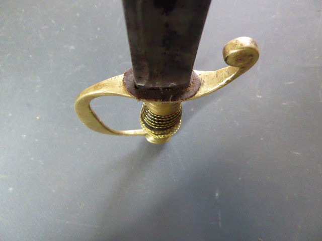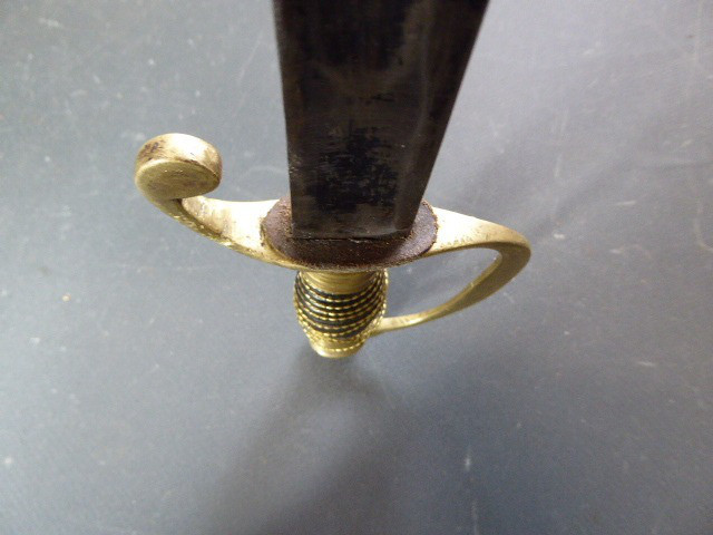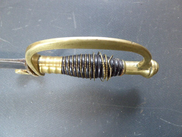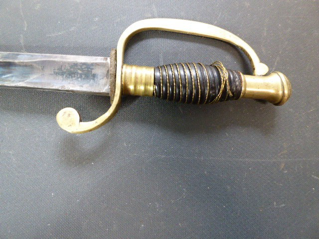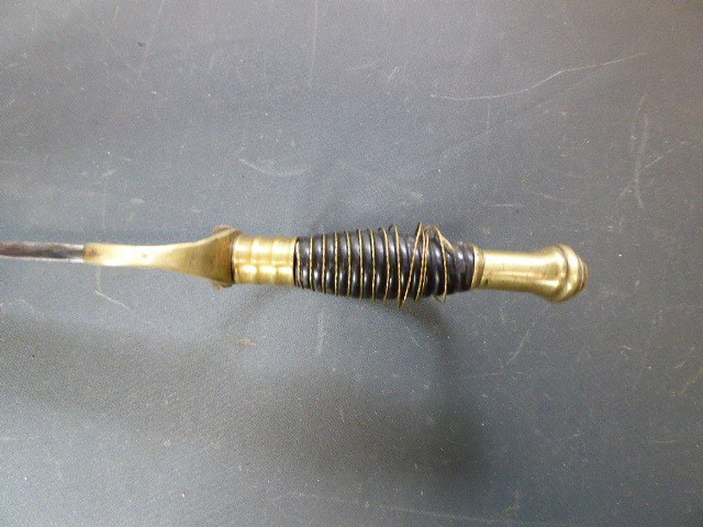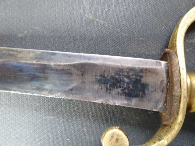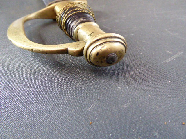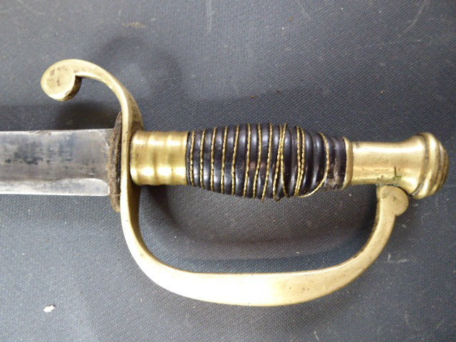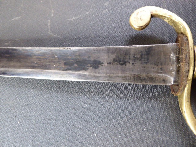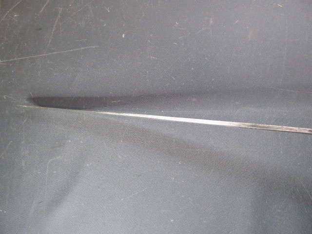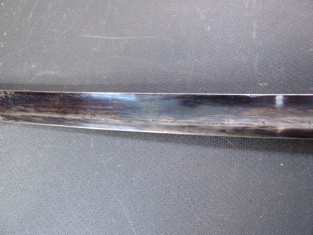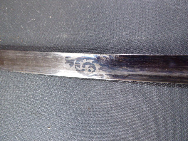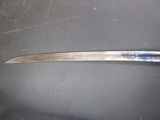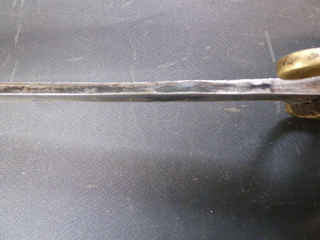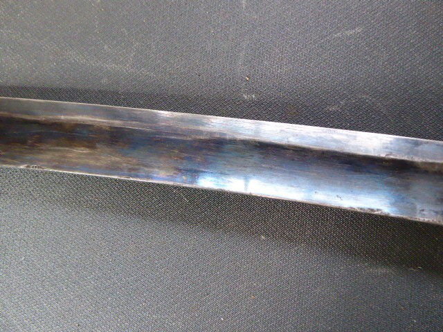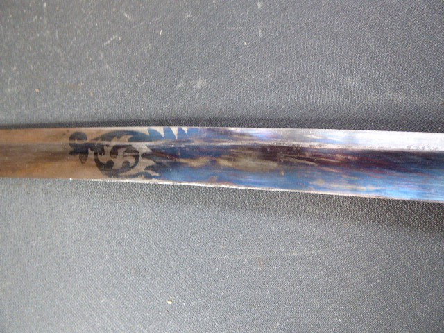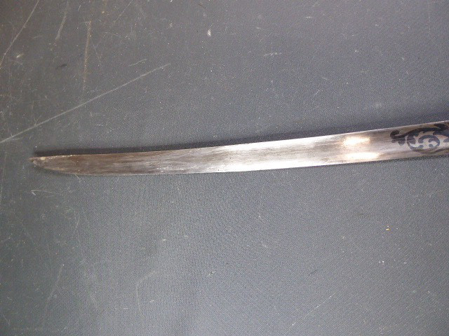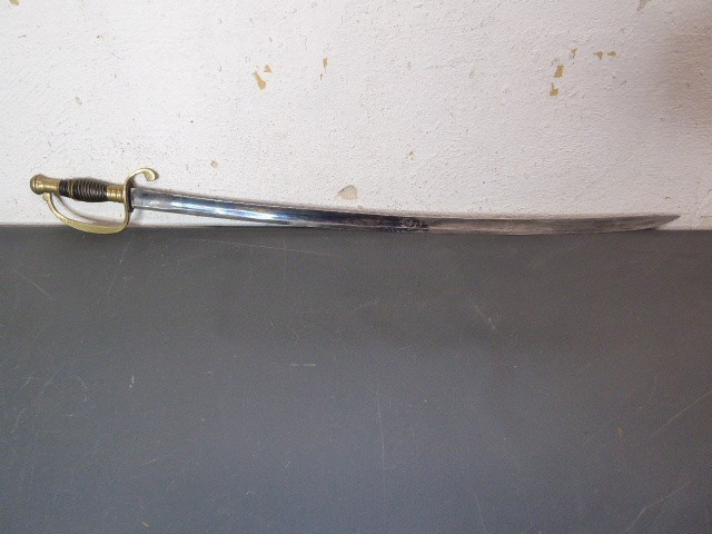 Aus meiner Sammlung gebe ich, ein alten Unbekannten Säbel ohne Scheide breite gekehlte verzierte Klinge bis zur hälfte Gebläut ab. Kenner werden es sicherlich wissen wo das Teil einzuordnen ist. Griff Horn mit einer Drahtwicklung, Wicklung ist Lose. Gefäß Messing mit einem Bügel und Messing Knauf. Einschneidige Klinge, beidseitig mit breiten Kehlungen und biss zur hälfte Gebläut und verzieret. Das Teil ist immer noch im Guten Sammelwürdigen Zustand. Alles andere entnehmen Sie Bitte den Fotos. Gesamtlänge: 85 cm, Klingenlänge: 72,5 cm, Klingenbreite: 2,7 cm. Kann zu jederzeit bei mir besichtigt werden. Privatauktion keine Rücknahme und Garantie.