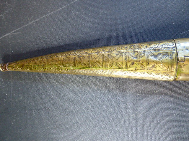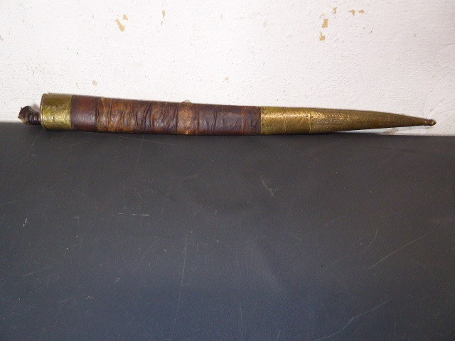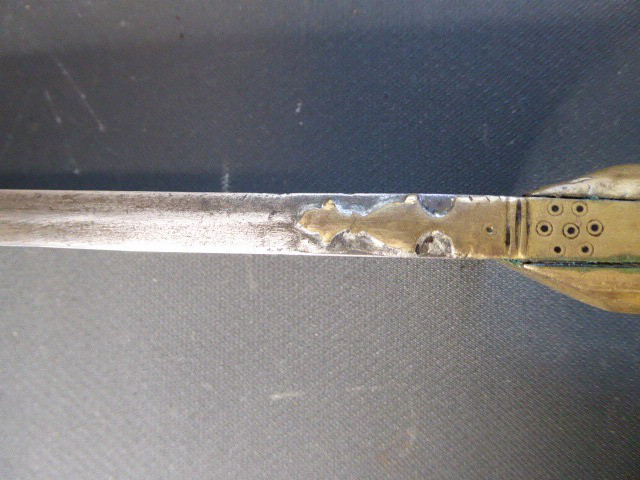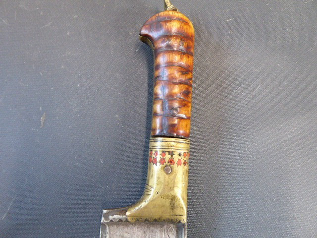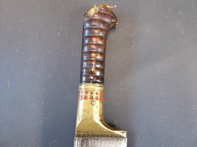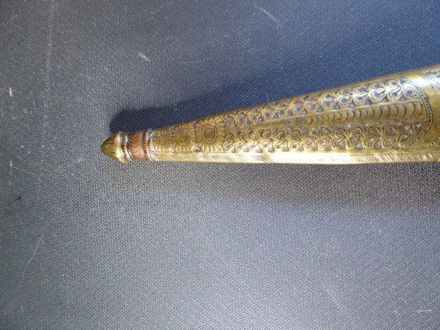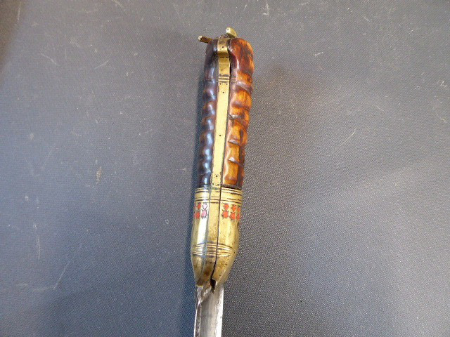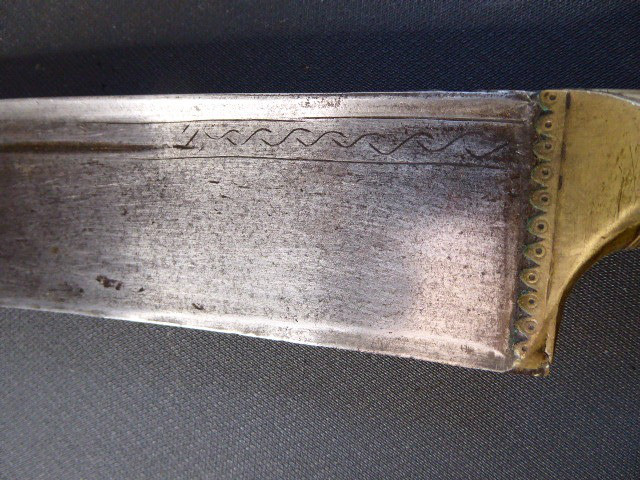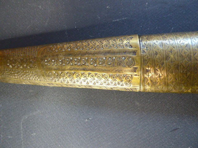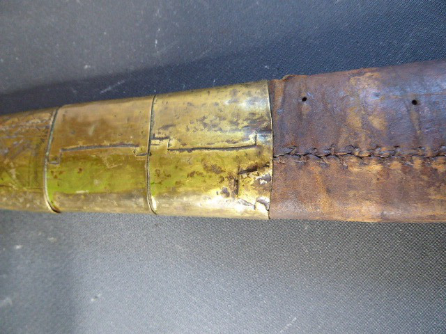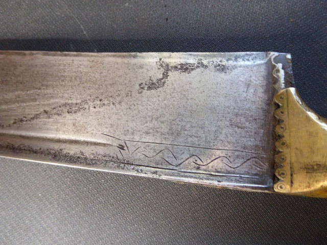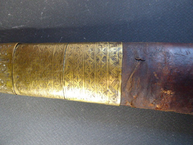 Aus meiner Sammlung gebe ich, ein altes Afghanisches Khyber Messer mit Scheide ab. Griff Hornschalen, eine Seite etwas abgesplittert, gefast in Messing Montierungen mit Ornamenten. Einschneidige breite T Klinge, beidseitig mit Eisenschnitt. Scheide Holz mit Leder ummantelt und zwei Messingbeschläge mit Ornamenten. Das Teil ist im Guten Sammelwürdigen Zustand. Alles andere entnehmen Sie Bitte den Fotos. Gesamtlänge: 82 cm, ohne Scheide: 72 cm, Klingenlänge: 58 cm, Klingenbreite: 4,9 cm. Kann zu jederzeit bei mir besichtigt werden. Privatauktion keine Rücknahme und Garantie.