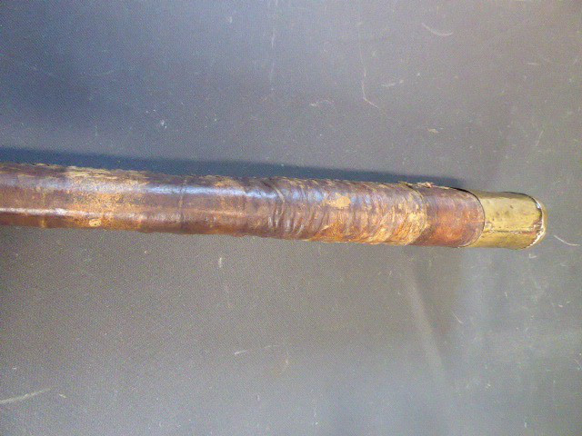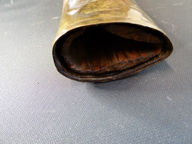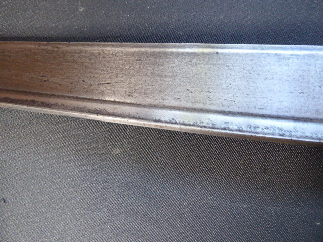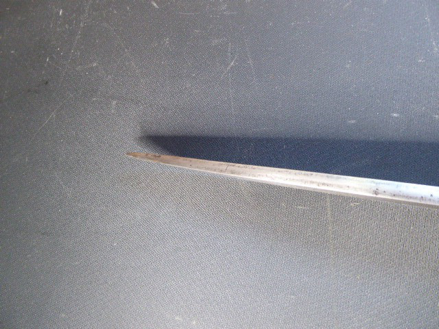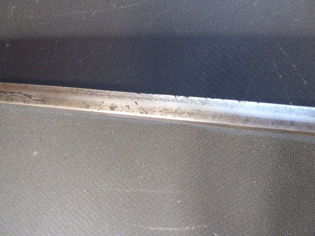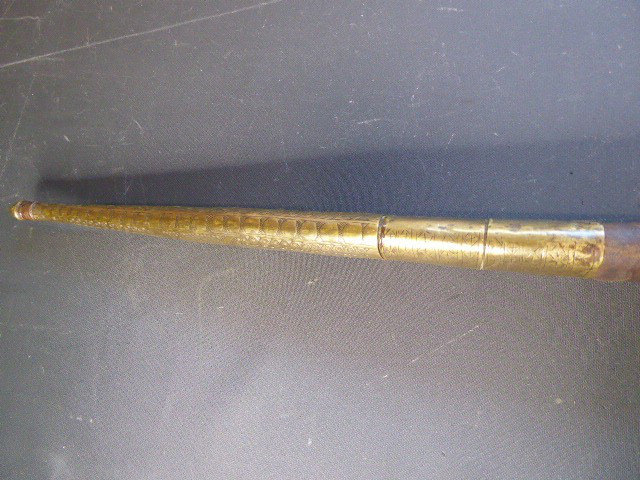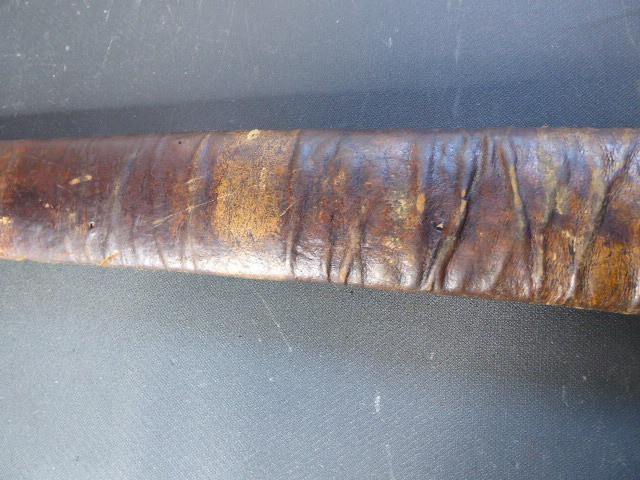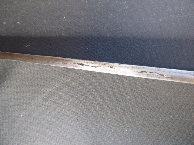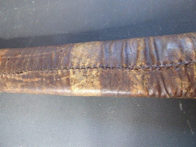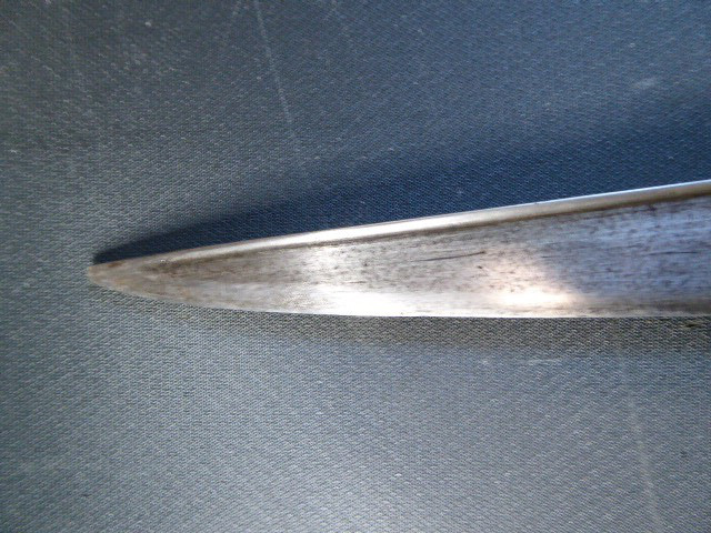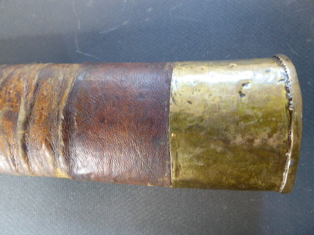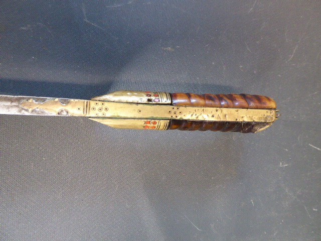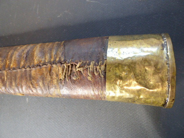 Aus meiner Sammlung gebe ich, ein altes Afghanisches Khyber Messer mit Scheide ab. Griff Hornschalen, eine Seite etwas abgesplittert, gefast in Messing Montierungen mit Ornamenten. Einschneidige breite T Klinge, beidseitig mit Eisenschnitt. Scheide Holz mit Leder ummantelt und zwei Messingbeschläge mit Ornamenten. Das Teil ist im Guten Sammelwürdigen Zustand. Alles andere entnehmen Sie Bitte den Fotos. Gesamtlänge: 82 cm, ohne Scheide: 72 cm, Klingenlänge: 58 cm, Klingenbreite: 4,9 cm. Kann zu jederzeit bei mir besichtigt werden. Privatauktion keine Rücknahme und Garantie.