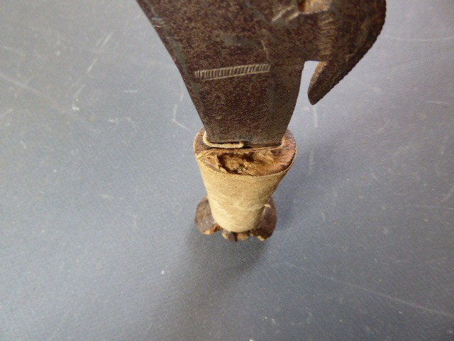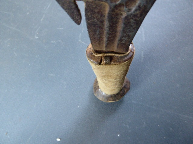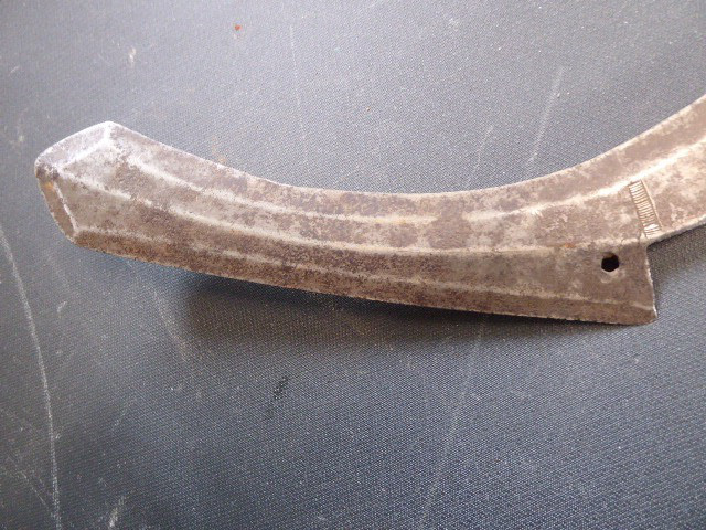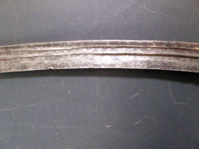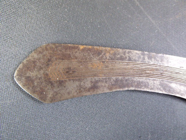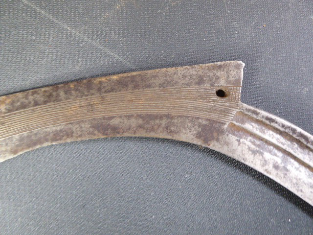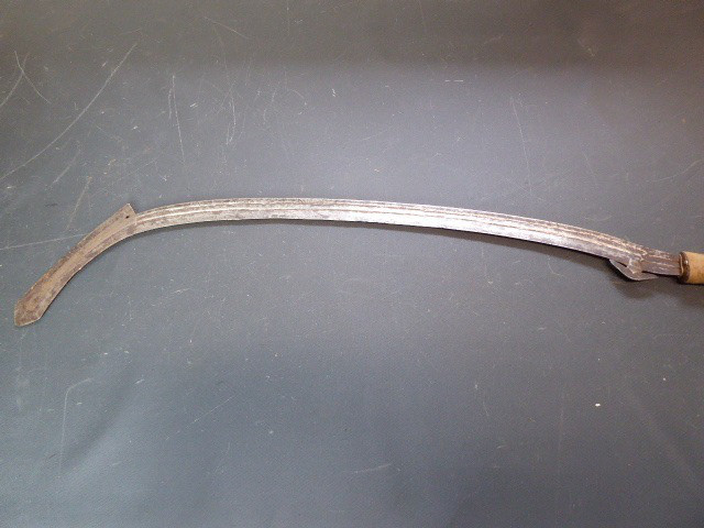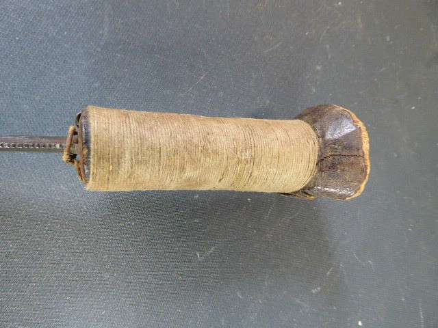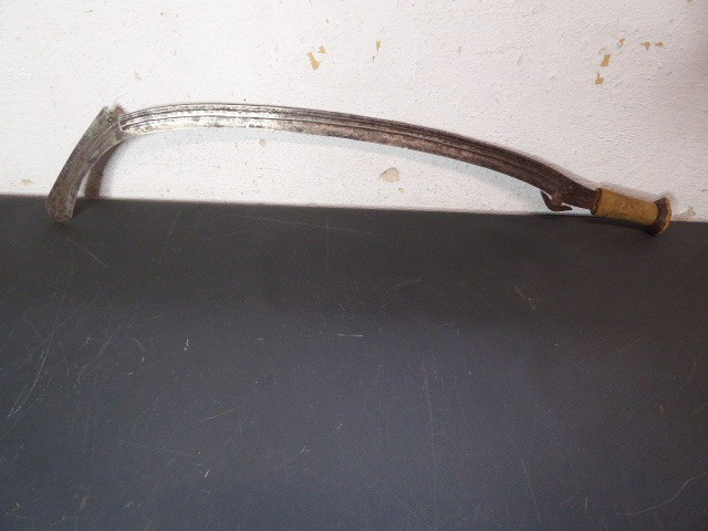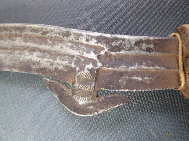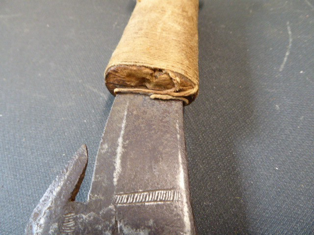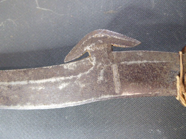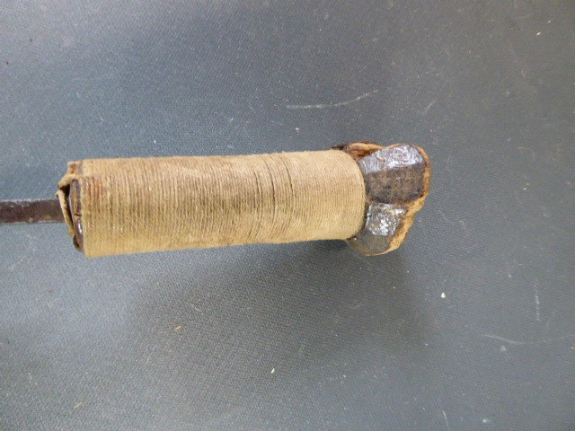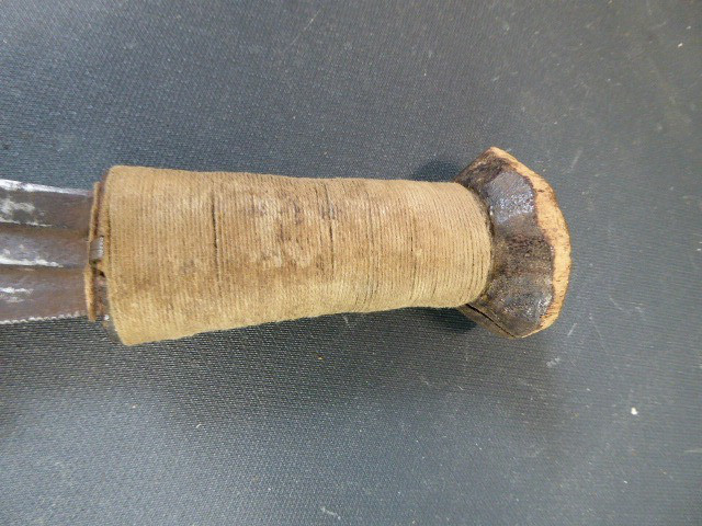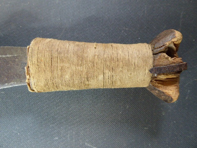 Aus meiner Sammlung gebe ich, ein altes langes Afrika Schwert ohne Scheide mit bizarrer Klinge und Eisenschnitt ab. Griff Holz mit feiner Schnurwicklung, Holz oben schon etwas zerschlissen. Einschneidige teilweise zweischneidige Bizarre Klinge mit einigen Eisenschnitt. Das Teil ist im Guten Sammelwürdigen Zustand. Alles andere entnehmen Sie Bitte den Fotos. Gesamtlänge: 81 cm, Klingenlänge: 71,5 cm, Klingenbreite: 3,1 cm. Kann zu jederzeit bei mir besichtigt werden. Privatauktion keine Rücknahme und Garantie.