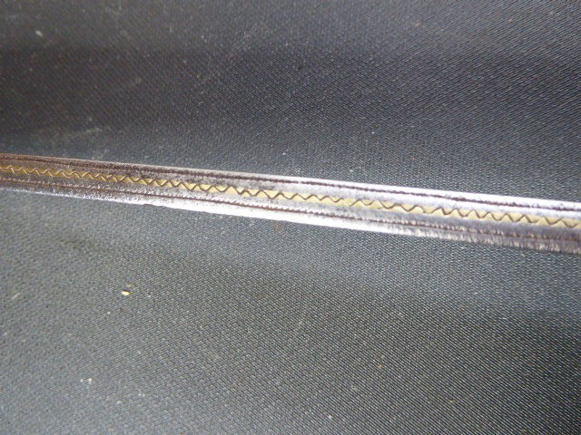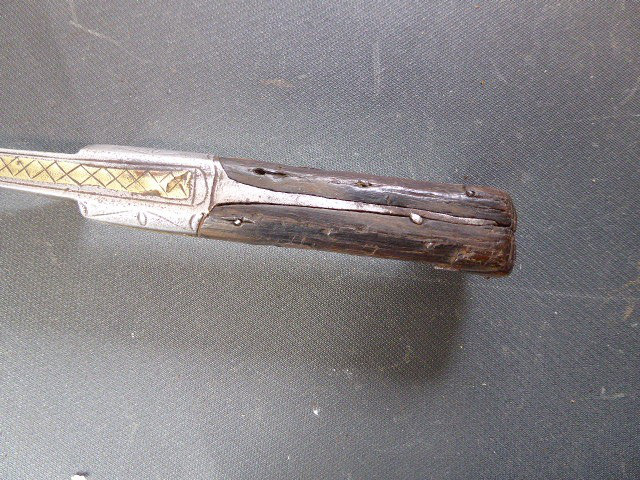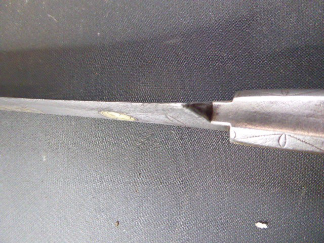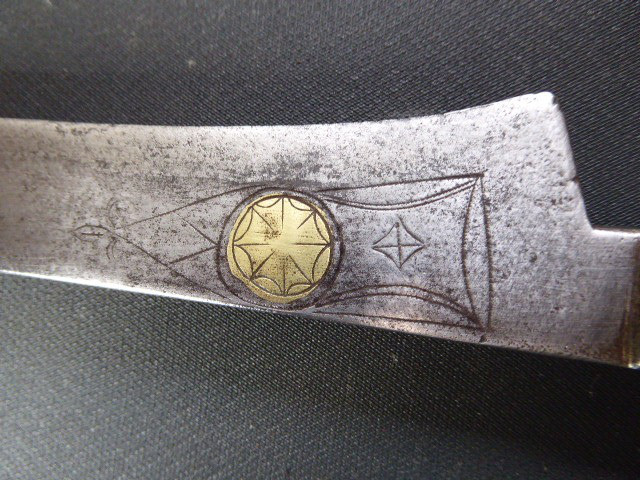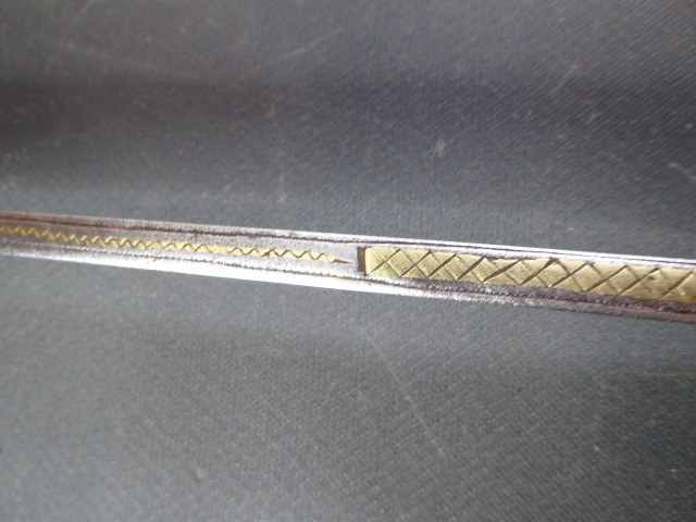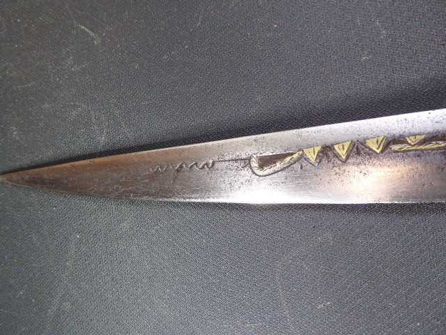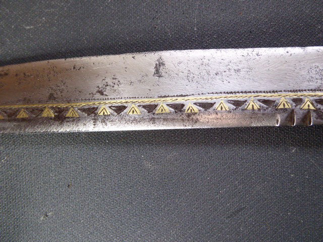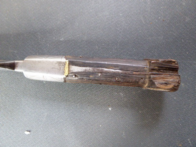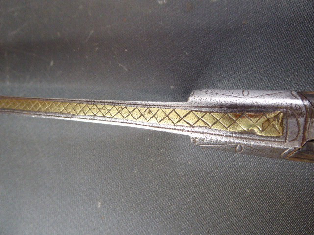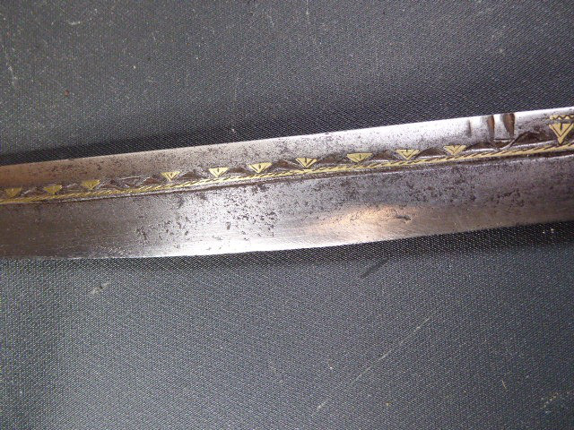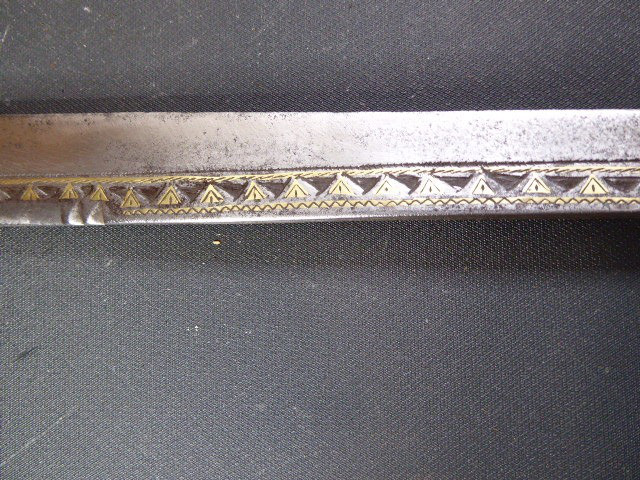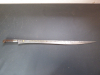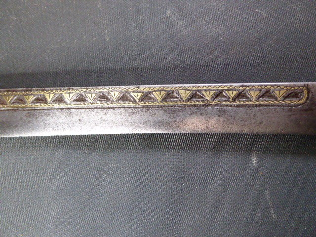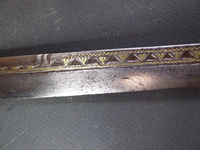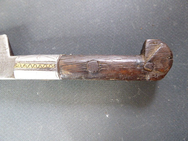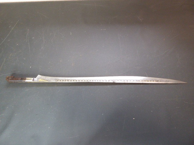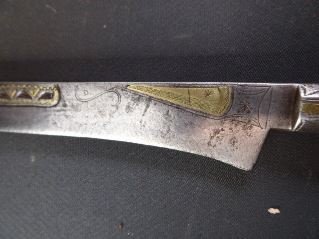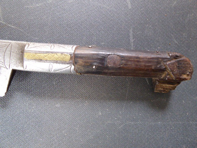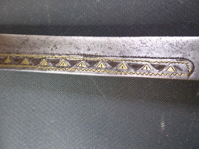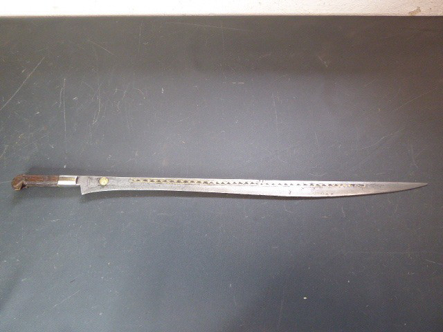 Aus meiner Sammlung gebe ich, ein altes langes Afrika Flyssa Schwert ohne Scheide Klinge beidseitig Eisenschnitt Messingeinlagen ab. Griff Holz/Horn teilweise zerschlissen. Einschneidige stabile Klinge beidseitig mit Eisenschnitt und Messingeinlagen. Das Teil ist im Guten Sammelwürdigen Zustand. Alles andere entnehmen Sie Bitte den Fotos. Gesamtlänge: 75,3 cm, Klingenlänge: 63,5 cm, Klingenbreite: 3,3 cm. Kann zu jederzeit bei mir besichtigt werden. Privatauktion keine Rücknahme und Garantie.