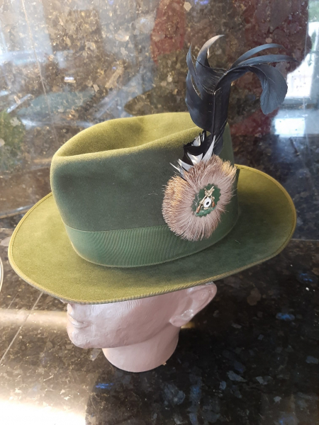 Hut aus hochwertigen Filz mit Lederschweisband, Seidenripsband und Gamsbart mit Feder.