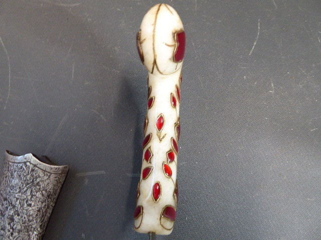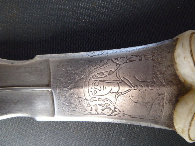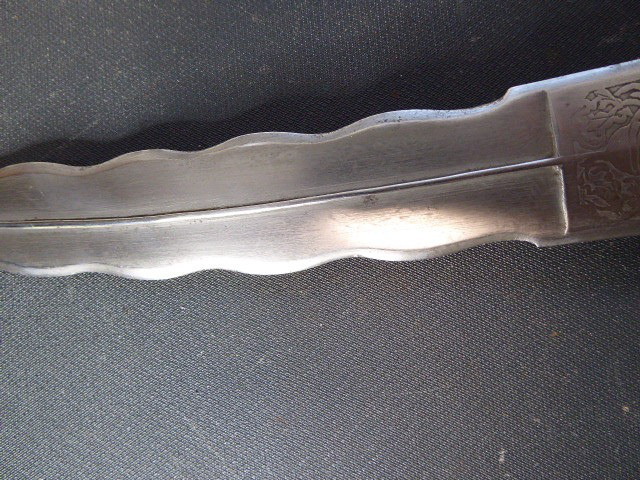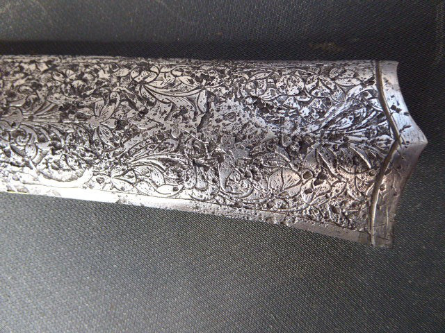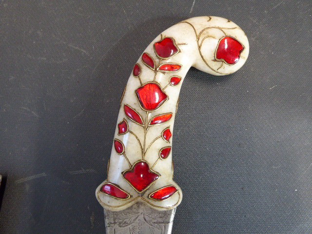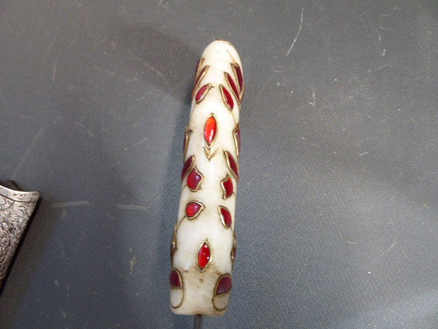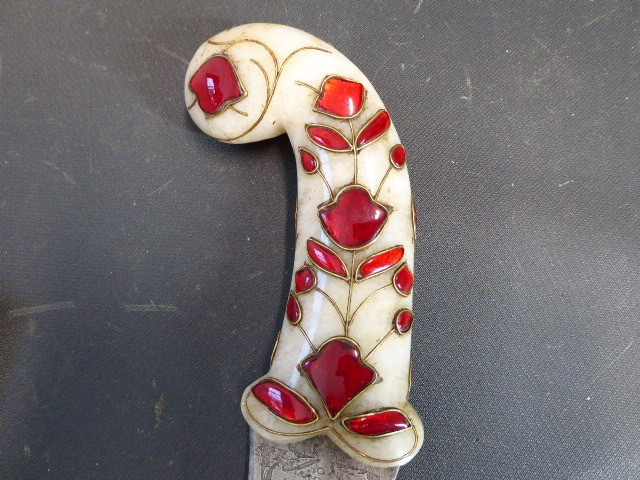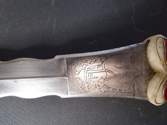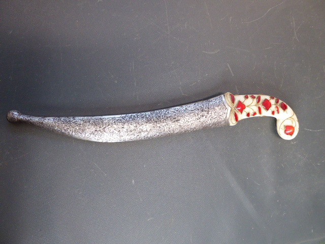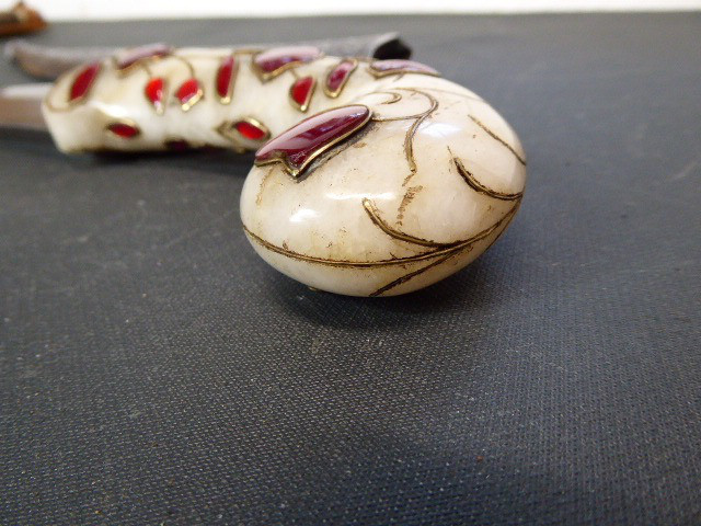 Aus meiner Sammlung gebe ich, ein alten Indischen Dolch mit Metallscheide gewellte Klinge Damast/Wootz? Griff weiße Jade ab. Griff weiße Jade mit Bizarren roten Glassteine in Messing gefast. Zweischneidige gewellte Damast/Wootz? Klinge, beidseitig am Ansatz Figürlichen Eisenschnitt mit starken Mittelgrad. Scheide Eisen mit Holzeinsatz, komplett mit Floralem Eisenschnitt, aber schon sehr Narbig. Sehr Aufwendig gearbeitetes Teil. Das Teil ist im Guten Sammelwürdigen Zustand, außer die Scheide. Alles andere entnehmen Sie Bitte den Fotos. Gesamtlänge: 45 cm, ohne Scheide: 42,5 cm, Klingenlänge: 29,3 cm, Klingenbreite: 4,6 cm. Kann zu jederzeit bei mir besichtigt werden. Privatauktion keine Rücknahme und Garantie.