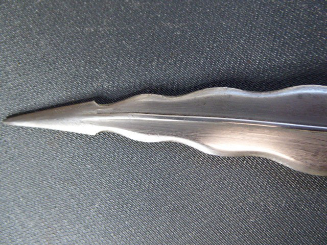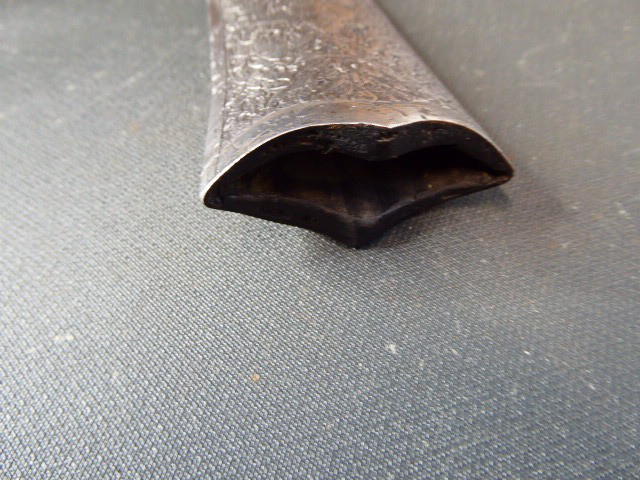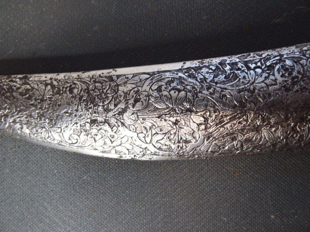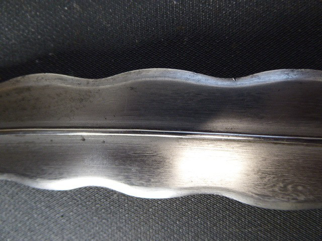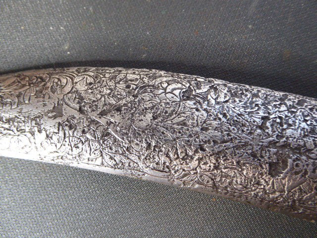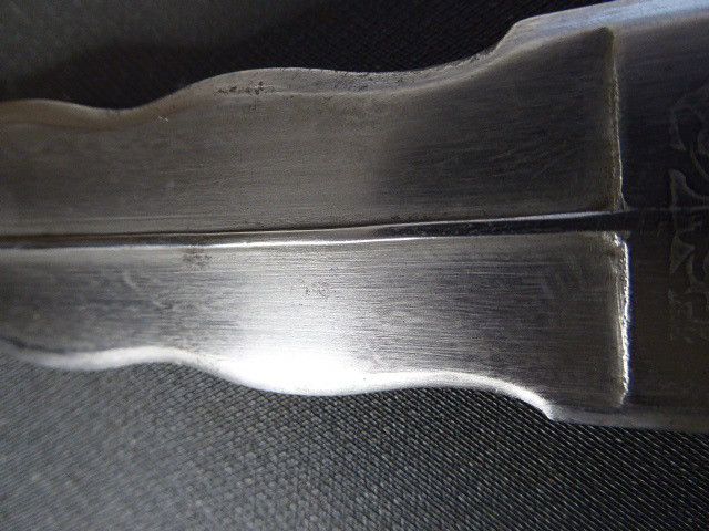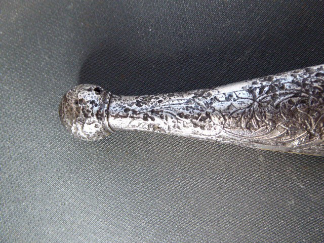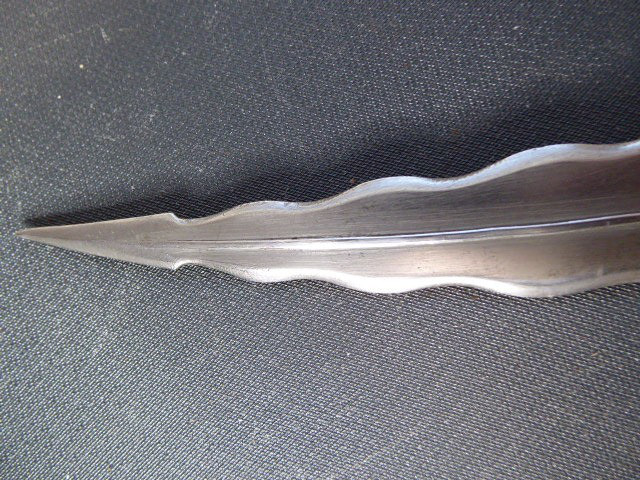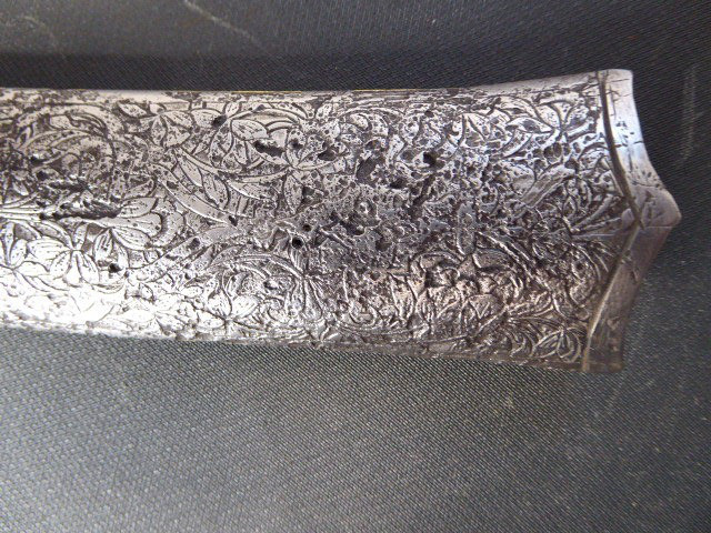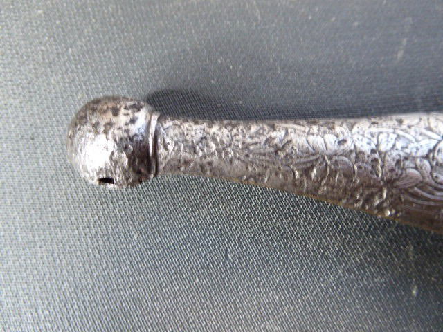 Aus meiner Sammlung gebe ich, ein alten Indischen Dolch mit Metallscheide gewellte Klinge Damast/Wootz? Griff weiße Jade ab. Griff weiße Jade mit Bizarren roten Glassteine in Messing gefast. Zweischneidige gewellte Damast/Wootz? Klinge, beidseitig am Ansatz Figürlichen Eisenschnitt mit starken Mittelgrad. Scheide Eisen mit Holzeinsatz, komplett mit Floralem Eisenschnitt, aber schon sehr Narbig. Sehr Aufwendig gearbeitetes Teil. Das Teil ist im Guten Sammelwürdigen Zustand, außer die Scheide. Alles andere entnehmen Sie Bitte den Fotos. Gesamtlänge: 45 cm, ohne Scheide: 42,5 cm, Klingenlänge: 29,3 cm, Klingenbreite: 4,6 cm. Kann zu jederzeit bei mir besichtigt werden. Privatauktion keine Rücknahme und Garantie.